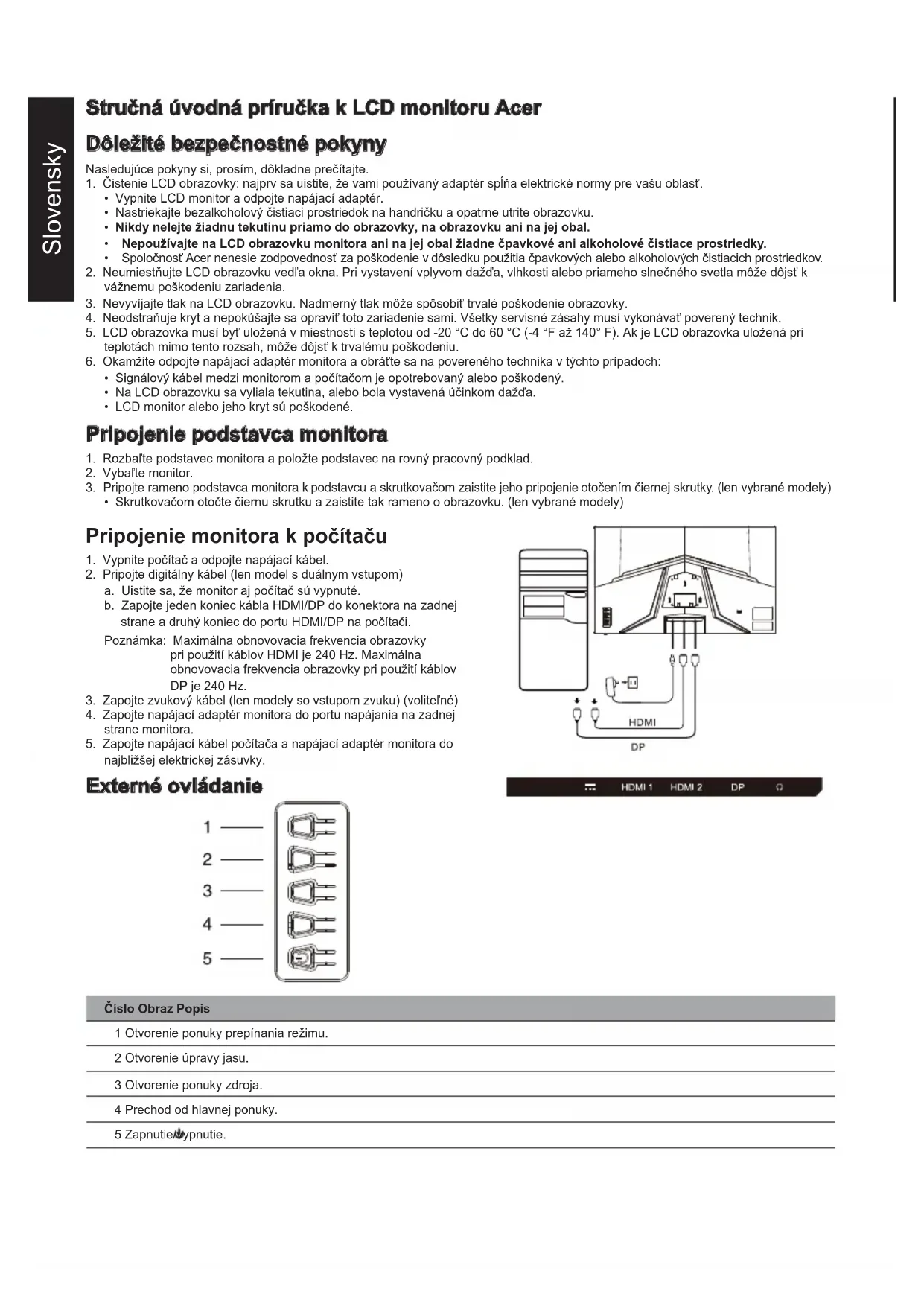 4. Neodstraňuje kryt a nepokúšajte sa opraviť toto zariadenie sami. Všetky servisné zásahy musí vykonávať poverený technik. 5. LCD obrazovka musí byť uložená v miestnosti s teplotou od -20 °C do 60 °C (-4 °F až 140° F). Ak je LCD obrazovka uložená pri teplotách mimo tento rozsah, môže dôjsť k trvalému poškodeniu.