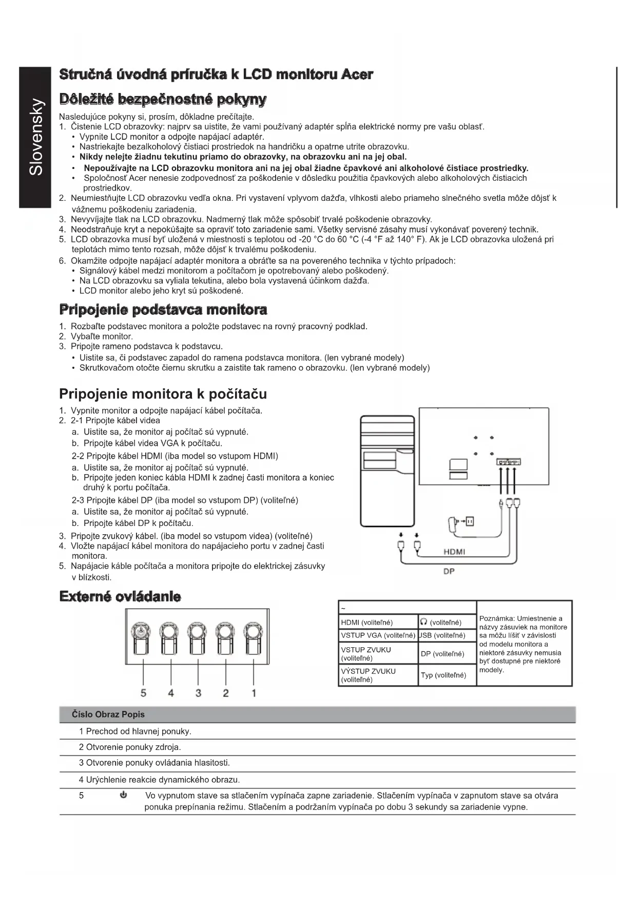 HDMI (iba model so vstupom HDMI) (voliteľné) Reproduktory 2 W x 2 (iba model so vstupom videa) (voliteľné) Maximálna veľkosť obrazovky Horizontálny: 596,736 mm Vertikálny: 335,664 mm Zdroj napájania VSTUP: 100-240 V ~ 50/60 Hz Prevádzkové prostredie Prevádzková teplota: 0° až 40 °C Skladovacia teplota: -20° až 60 °C Prevádzková vlhkosť: 20 % až 80 % Rozmery 610,5 (Š) x 446,3 (V) x 195,9 (H) mm Hmotnosť (čistá hmotnosť) 3,9 kg (netto) Mechanické parametre Naklonenie: -5° až +20° Natočenie: Nie Nastavenie výšky: Nie Preklopenie: Nie Odpojiteľný stojan s pätkou: Áno Externé ovládače Prepínače/Tlačidlá Hlavný vypínač Klávesová skratka 1 Klávesová skratka 2 Klávesová skratka 3 Klávesová skratka 4 Funkcie Jas Kontrast Modré svetlo Zosilnenie čiernej ACM Super ostrosť Gama Teplota farby Režimy Režim sRGB Režim odtieňov sivej 6-osová odtieň 6-osová sýtosť Hlasitosť Stlmiť Pretaktovanie Adaptívna synchronizácia VRB Hodnota obnovovacej frekvencie Mieridlo Jazyk Časový limit ponuky na obrazovke Priehľadnosť Zámok ponuky na obrazovke Vstup Automatický zdroj Formát DP Širokouhlý režim Priradenie klávesovej skratky DDC/CI Úroveň čiernej na HDMI Režim rýchleho spustenia Informácie Parametre sa líšia v závislosti od modelu a/alebo oblasti. Návody na obsluhu a ďalšiu dokumentáciu týkajúcu sa vášho výrobku Acer nájdete na oficiálnej internetovej stránke zákazníckej podpory spoločnosti Acer.