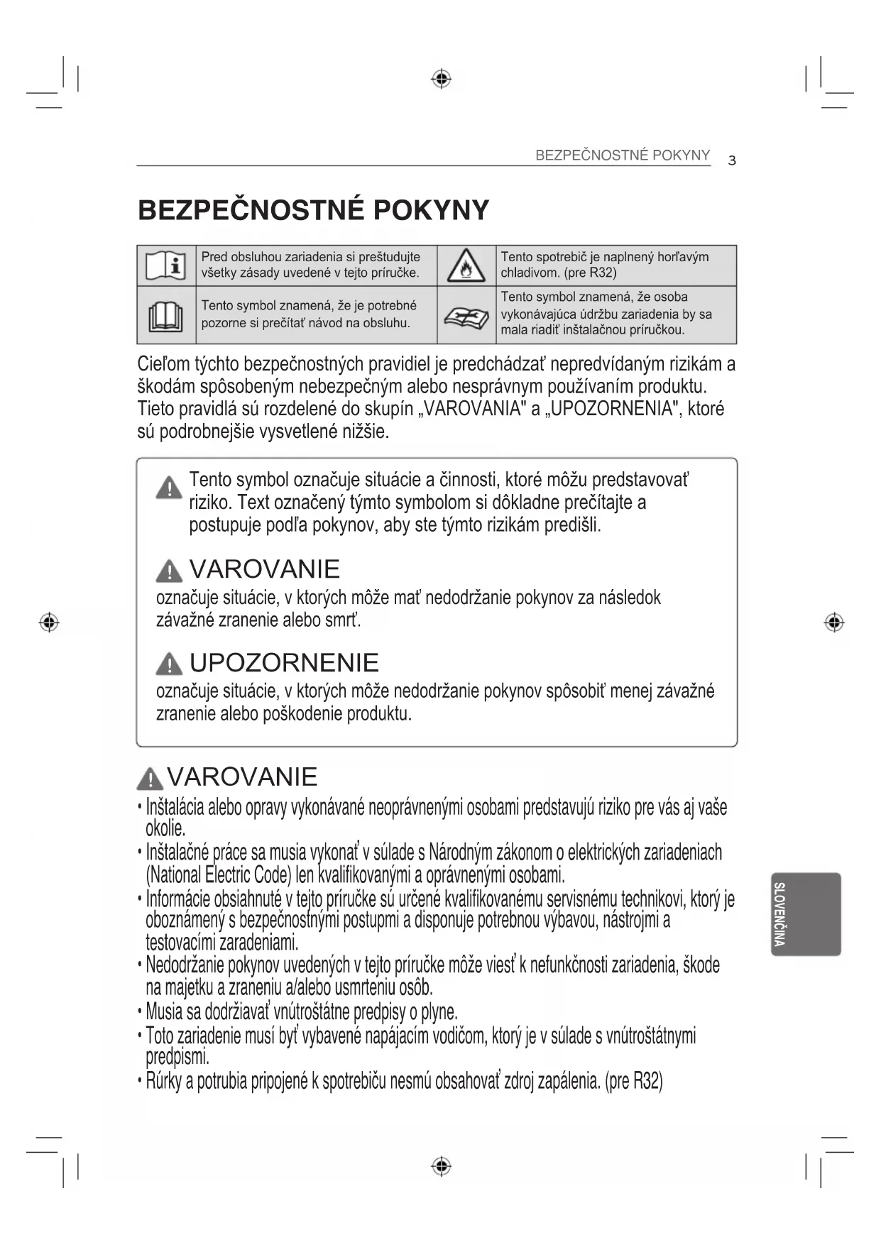 Preklad pôvodného pokynu (R32) Tento návod je zjednodušená verzia originálneho návodu. Originálny návod je k dispozícii na webovej lokalite www.lg.com. KLIMATIZÁCIA Prosím, pred nainštalovaním výrobku prečítajte celú túto príručku. Prosím, po dôkladnom prečítaní tejto príručky si ju ponechajte za účelom nahliadania v budúcnosti. Copyright © 2016 - 2022 LG Electronics Inc. Všetky práva vyhradené. www.lg.comBEZPEČNOSTNÉ POKYNY