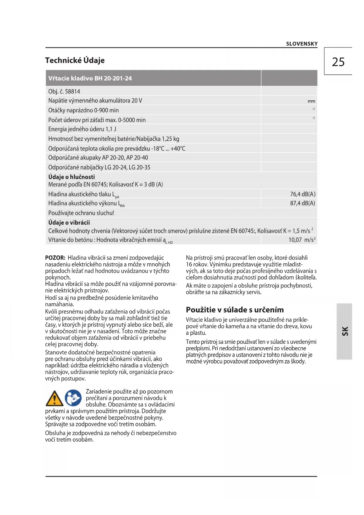 POZOR: Hladina vibrácií sa zmení zodpovedajúc nasadeniu elektrického nástroja a môže v mnohých prípadoch ležať nad hodnotou uvádzanou v týchto pokynoch. Hladina vibrácií sa môže použiť na vzájomné porovna- nie elektrických prístrojov. Hodí sa aj na predbežné posúdenie kmitavého namáhania. Kvôli presnému odhadu zaťaženia od vibrácií počas určitej pracovnej doby by sa mali zohľadniť tiež tie časy, v ktorých je prístroj vypnutý alebo síce beží, ale v skutočnosti nie je v nasadení. Toto môže značne redukovať objem zaťaženia od vibrácií v priebehu celej pracovnej doby. Stanovte dodatočné bezpečnostné opatrenia pre ochranu obsluhy pred účinkami vibrácií, ako napríklad: údržba elektrického náradia a vložených nástrojov, udržiavanie teploty rúk, organizácia praco- vných postupov. Zariadenie použite až po pozornom prečítaní a porozumení návodu k obsluhe. Oboznámte sa s ovládacími prvkami a správnym použitím prístroja. Dodržujte všetky v návode uvedené bezpečnostné pokyny. Správajte sa zodpovedne voči tretím osobám. Obsluha je zodpovedná za nehody či nebezpečenstvo voči tretím osobám. Na prístroji smú pracovať len osoby, ktorédosiahli 16 rokov. Výnimku predstavuje využitie mladist- vých,ak sa toto deje počas profesijného vzdelávania s cieľomdosiahnutia zručností pod dohľadom školiteľa. Ak máte o zapojení a obsluhe prístroja pochybnosti, obráťte sa na zákaznícky servis. Použitie v súlade s určením Vŕtacie kladivo je univerzálne použiteľné na príkle- pové vŕtanie do kameňa a na vŕtanie do dreva, kovu a plastu. Tento prístroj sa smie použivať len v súlade s uvedenými predpismi. Pri nedodržaní ustanovení zo všeobecne platných predpisov a ustanovení z tohto návodu nie je možné výrobcu považovať zodpovedným za škody.D