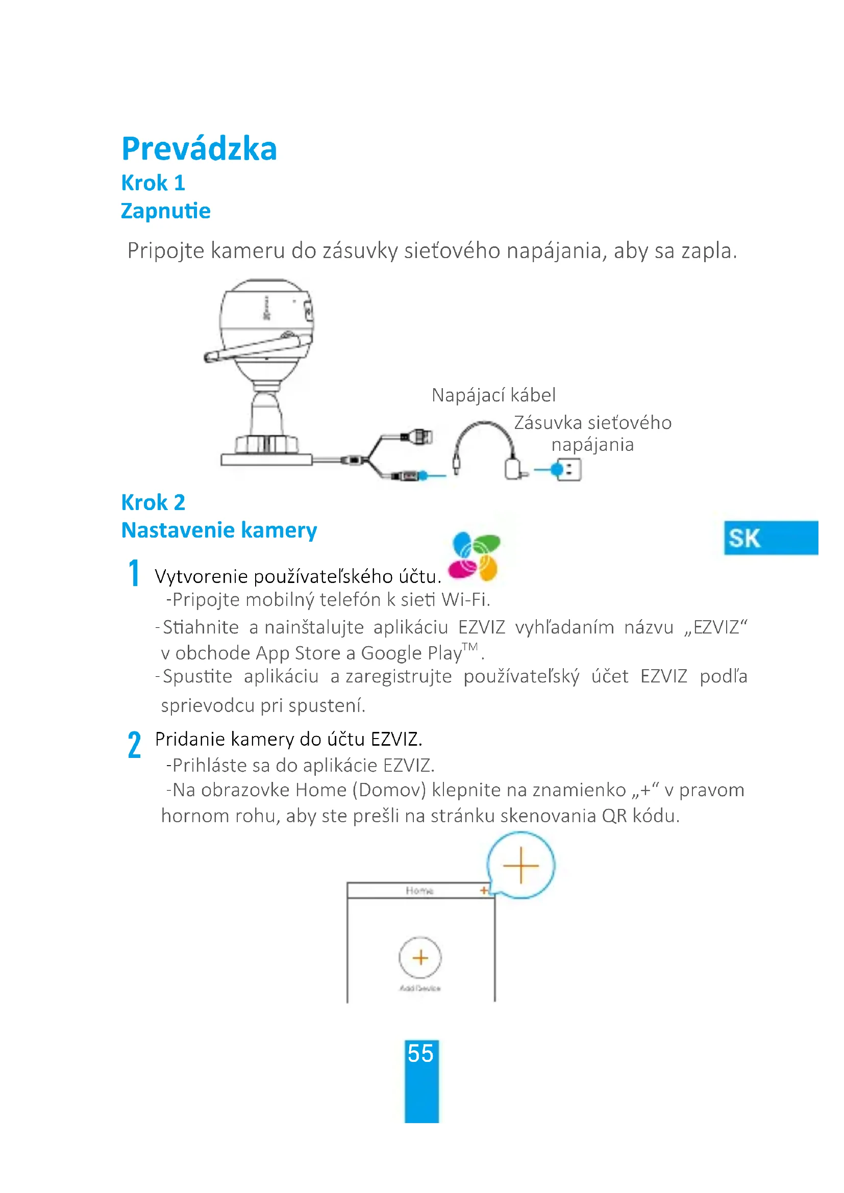 Vytvorenie používateľského účtu. -Pripojte mobilný telefón k sie Wi-Fi. -Sahnite a nainštalujte aplikáciu EZVIZ vyhľadaním názvu „EZVIZ“ v obchode App Store a Google Play