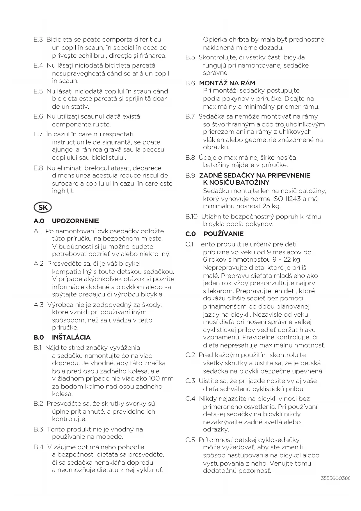 C.1 Tento produkt je určený pre deti približne vo veku od 9mesiacov do 6rokov shmotnosťou 9–22kg. Neprepravujte dieťa, ktoré je príliš malé. Prepravu dieťaťa mladšieho ako jeden rok vždy prekonzultujte najprv slekárom. Prepravujte len deti, ktoré dokážu dlhšie sedieť bez pomoci, prinajmenšom po dobu plánovanej jazdy na bicykli. Nezávisle od veku musí dieťa pri nosení správne veľkej cyklistickej prilby vedieť udržať hlavu vzpriamenú. Pravidelne kontrolujte, či dieťa nepresahuje maximálnu hmotnosť. C.2 Pred každým použitím skontrolujte všetky skrutky auistite sa, že je detská sedačka na bicykli bezpečne upevnená. C.3 Uistite sa, že pri jazde nosíte vy aj vaše dieťa schválenú cyklistickú prilbu. C.4 Nikdy nejazdite na bicykli vnoci bez primeraného osvetlenia. Pri používaní detskej sedačky na bicykli nikdy nezakrývajte zadné svetlá alebo odrazky. C.5 Prítomnosť detskej cyklosedačky môže vyžadovať, aby ste zmenili spôsob nastupovania na bicykel alebo vystupovania zneho. Venujte tomu dodatočnú pozornosť.36 5560038001 C.6 Pred každou jazdou sa presvedčte, či namontovaná cyklosedačka neovplyvňuje brzdenie, pedálovanie alebo riadenie. C.7 Vždy používajte popruhy a dbajte na to, aby ste nimi dieťa správne pripútali. Uistite sa, či popruhy na telo apopruhy na nohy nie sú príliš voľné alebo či nemôžu uviaznuť vpohyblivých častiach, napríklad kolesách. To platí aj vtedy, keď používate bicykel bez dieťaťa vsedačke. C.8 Dbajte na to, aby sa oblečenie, obuv, hračky alebo časti tela dieťaťa nedostali do kontaktu so žiadnymi pohyblivými časťami bicykla, napríklad kolesami, lankami apružinami sedadla. Vzhľadom na rast dieťaťa to pravidelne kontrolujte. Pružiny sedadla možno zakryť vhodnými krytmi pružín. C.9 Dbajte na to, aby sa vdosahu dieťaťa nenachádzali žiadne ostré predmety, napríklad rozstrapkané lanká. C.10 Dieťa, ktoré sedí vsedačke, často potrebuje teplejšie oblečenie ako jazdec. Na ochranu pred nečakaným dažďom je vhodné mať so sebou nepremokavé oblečenie. Nikdy nejazdite vnevľúdnych alebo nebezpečných podmienkach, napríklad vchladnom počasí, ktoré by mohlo dieťaťu spôsobiť omrzliny. C.11 Pred posadením dieťaťa skontrolujte teplotu sedačky, najmä vhorúcich slnečných dňoch. C.12 Pri prevoze bicykla na vozidle odstráňte detskú sedačku. Turbulencia vzduchu môže poškodiť sedačku alebo uvoľniť jej upevnenie, čo by mohlo mať za následok nehodu. C.13 Pred použitím si overte, či neexistujú štátne zákony anariadenia týkajúce sa prepravy dieťaťa vdetskej cyklosedačke.