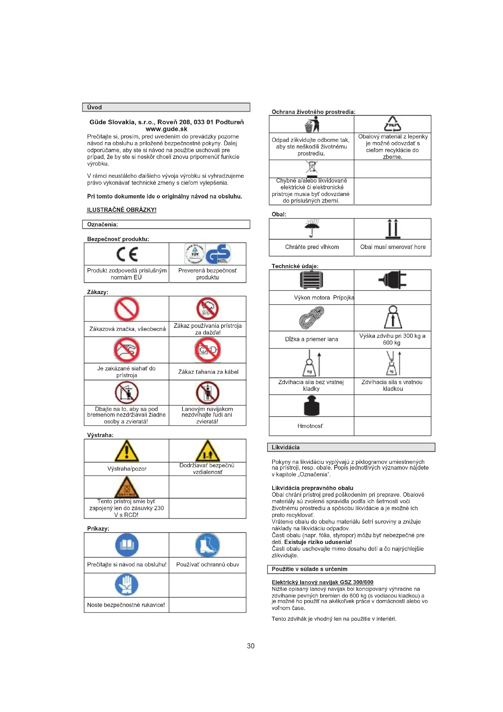 Pred uvedením do prevádzky a po akomkoĐvek náraze skontrolujte prístroj z hĐadiska známok opotrebenia alebo poškodenia a nechajte vykonaĢ nevyhnutné opravy. x Nikdy nepoužívajte náhradné diely a príslušenstvá neodporúþané výrobcom. x Prístroj používajte len za denného svetla alebo pri dostatoþnom umelom osvetlení. x Dbajte na to, aby žiadne predmety nespôsobili skrat na kontaktoch prístroja. x Všetky káble ukladajte tak, aby nevzniklo nebezpeþenstvo potknutia sa a bolo vylúþené poškodenie kábla! x Po celý þas vykonávania prác noste pre dané prostredie vhodný ochranný odev a prijmite pre dané prostredie vhodné preventívne opatrenia na prevenciu nehôd. x Kábel nepoužívajte na iný než predpísaný úþel. Prístroj nenoste za kábel a kábel nepoužívajte ani na to, aby ste vytiahli zástrþku zo zásuvky. Kábel chráĖte pred nadmernými teplotami, olejom a ostrými hranami. x O svoj prístroj sa starostlivo starajte. Udržujte ho v þistote, aby sa s ním dalo dobre a bezpeþne pracovaĢ. Pravidelne kontrolujte zástrþku a kábel a v prípade poškodenia nechajte kábel vymeniĢ autorizovaným odborníkom. Kon trolujte pravidelne predlžovacie káble a poškodené káble nechajte vyme niĢ odborníkom. x Predlžovacie káble na vonkajšie použitie. Vonku používajte len na tento úþel schválené a zodpovedajúcim spôsobom oznaþené predlžovacie káble (do 20 m 1,5 mm2, 20 – 50 m 2,5 mm2) x Prístroj odpojte od siete - pred každým þistením - po každom použití x Oso by, ktoré vćaka svojim fyzickým, zmyslovým þi duševným schopnostiam alebo svojej neskúsenosti þi neznalosti nie sú schopné prístroj obsluhovaĢ, nesmú prístroj používaĢ. x Ak prístroj, napájací kábel þi oceĐové lano vykazujú viditeĐné poškodenie, prístroj nesmie byĢ uvedený do prevádzky. x Ak je poškodený napájací kábel tohto prístroja, musí ho vymeniĢ výrobca alebo elektrikár. 31x Opravy na tomto prístroji smie vykonávaĢ iba elektrikár. V dôsledku neodborných opráv môžu vznikaĢ znaþné riziká. x Pre príslušenstvo platia tie isté predpisy. Güde GmbH & Co. KG neruþí za škody spôsobené: x poškodením prístroja v dôsledku mechanických vplyvov a preĢaženia. x zmenami prístroja x použitím na iné úþely, než aké sú popísané v návode. x Dodržujte bezpodmieneþne všetky bezpeþnostné pokyny, aby ste zabránili úrazom a škodám. Dôležité bezpeþnostné pokyny x Lanový navijak musí byĢ pred zaþatím prác skontrolovaný z hĐadiska bezchybnej funkcie všetkých svojich komponentov. Skontrolujte predovšetkým bezchybný stav karabínových hákov, ktoré bránia neplánovanému uvoĐneniu bremenového háka z viazacích prostriedkov (laná, krúžky, prepravné oká atć.). x Lanový navijak je dovolené používaĢ iba na zdvíhanie bremien, ktorých hmotnosĢ neprekraþuje maximálnu nosnosĢ uvádzanú výrobcom v technických údajoch a na typovom štítku lanového navijaka. x Bremená upevnené v rozpore s predpismi, ktoré by mohli spadnúĢ na zem, sa nesmú zdvíhaĢ. Bremeno predpisovo priviažte. Bremená sa smú zdvíhaĢ zásadne iba vo zvislej polohe! Nikdy neĢahajte a nezdvíhajte v šikmej polohe! x Pod bremenom alebo v nebezpeþnej oblasti sa nesmú – okrem obsluhy – zdržiavaĢ žiadne osoby. Dodržujte minimálny odstup 10 m od zdvíhaného bremena. x Každé zdvíhanie je dovolené iba s použitím príslušných upevĖovacích prvkov (laná, krúžky, prepravné oká atć.) a v súlade s príslušnými ustanoveniami a normami platnými na pracovisku. x Kovové lano navijaka sa nesmie používaĢ na upevĖovanie bremien. x Uvedenie lanového navijaka do prevádzky je prípustné iba s perfektne vyrovnaným lanom. x Lanový navijak nie je dovolené nechávaĢ bez dozoru so zdvihnutými bremenami. x Pred zaþatím prác s lanovým navijakom je nutné skontrolovaĢ únosnosĢ nosných štruktúr. x Pred zaþatím práce s lanovým navijakom skontrolujte laná z hĐadiska opotrebenia; pri známkach opotrebenia musia byĢ tieto laná nahradené novými, ktorých vlastnosti musia zodpovedaĢ max. prípustnej nosn osti lanového navijaka. Laná musia b yĢ nahradené len originálnymi náhradnými lanami. x V prípade problé mov s fungovaním lanového navijaka sa obráĢte na vášho autorizovaného predajcu a vyvarujte sa akejkoĐvek improvizácie. x Motor na pohon lanového navijaka nie je vybavený motorovým istiþom. Motor preto nie je dovolené v prípade Ģažkostí pri zdvíhaní preĢažovaĢ; v tom prípade skontrolujte, þi zdvíhané bremeno neprekraþuje prípustnú nosnosĢ lanového navijaka a þi nedošlo k poklesu sieĢového napätia. x Aby ste mohli v prípade hroziaceho nebezpeþenstva vþas zasiahnuĢ, musí obsluha lanový navijak obsluhovaĢ z vhodného miesta, aby mohla kontrolovaĢ celý pracovný priestor.
