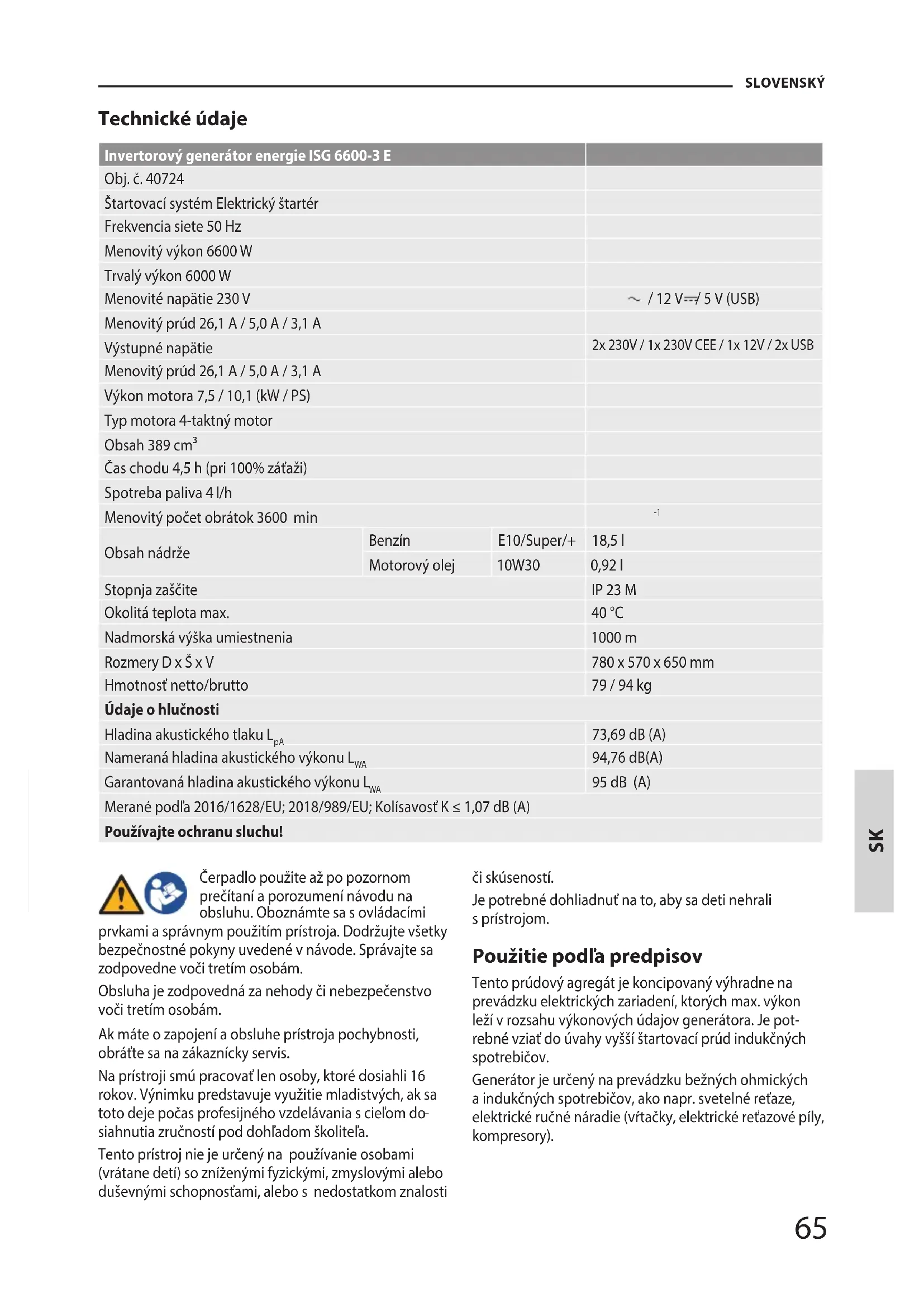 siahnutia zručností pod dohľadom školiteľa. Tento prístroj nie je určený na používanie osobami (vrátane detí) so zníženými fyzickými, zmyslovými alebo duševnými schopnosťami, alebo s nedostatkom znalosti či skúseností. Je potrebné dohliadnuť na to, aby sa deti nehrali sprístrojom. Použitie podľa predpisov Tento prúdový agregát je koncipovaný výhradne na prevádzku elektrických zariadení, ktorých max. výkon leží v rozsahu výkonových údajov generátora. Je pot- rebné vziať do úvahy vyšší štartovací prúd indukčných spotrebičov. Generátor je určený na prevádzku bežných ohmických a indukčných spotrebičov, ako napr. svetelné reťaze, elektrické ručné náradie (vŕtačky, elektrické reťazové píly, kompresory). SLOVENSKÝ66