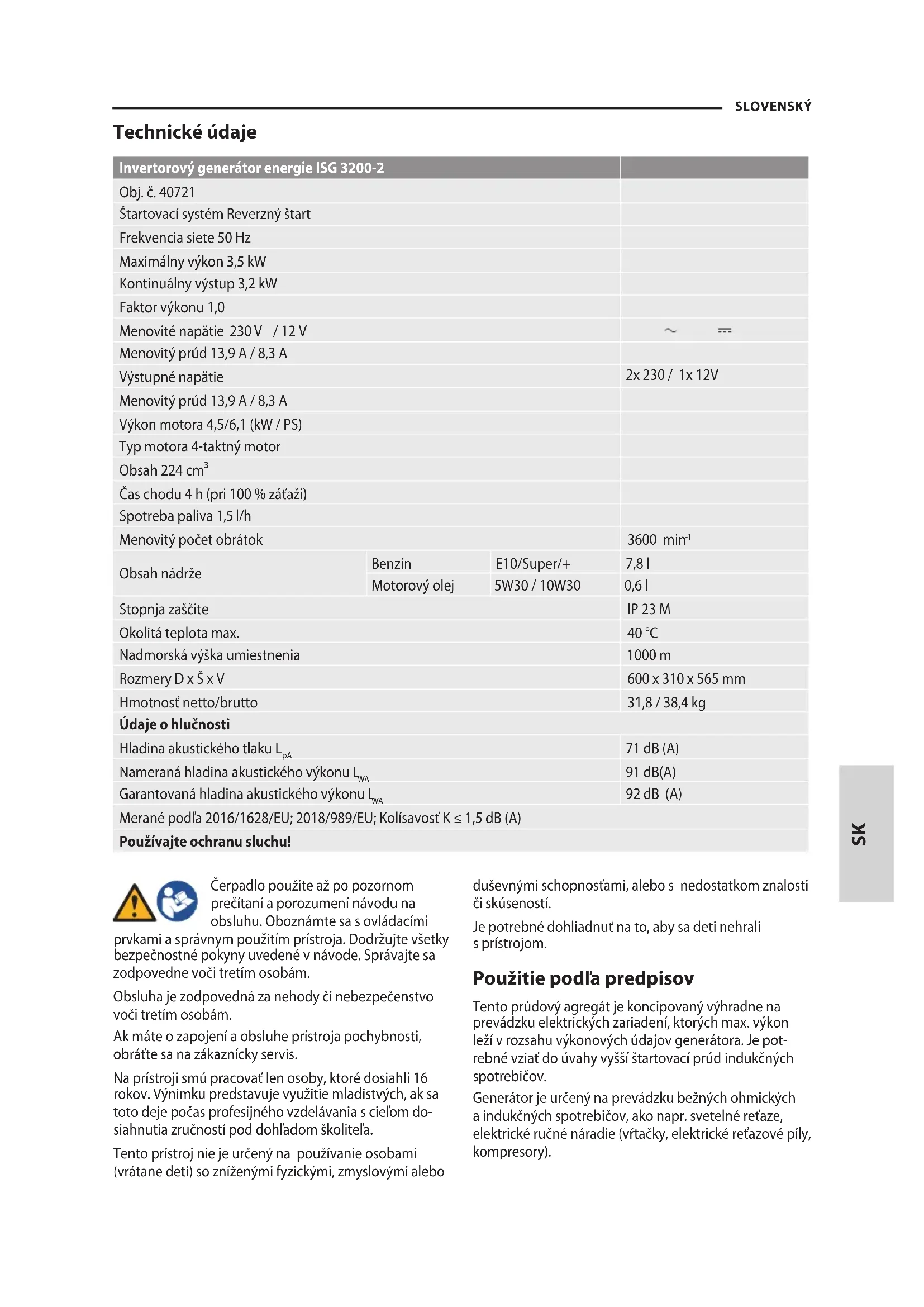 92 dB (A) Merané podľa 2016/1628/EU; 2018/989/EU; Kolísavosť K ≤ 1,5 dB (A) Používajte ochranu sluchu! Čerpadlo použite až po pozornom prečítaní a porozumení návodu na obsluhu. Oboznámte sa s ovládacími prvkami a správnym použitím prístroja. Dodržujte všetky bezpečnostné pokyny uvedené v návode. Správajte sa zodpovedne voči tretím osobám. Obsluha je zodpovedná za nehody či nebezpečenstvo voči tretím osobám. Ak máte o zapojení a obsluhe prístroja pochybnosti, obráťte sa na zákaznícky servis. Na prístroji smú pracovať len osoby, ktorédosiahli 16 rokov. Výnimku predstavuje využitie mladistvých,ak sa toto deje počas profesijného vzdelávania s cieľomdo- siahnutia zručností pod dohľadom školiteľa. Tento prístroj nie je určený na používanie osobami (vrátane detí) so zníženými fyzickými, zmyslovými alebo duševnými schopnosťami, alebo s nedostatkom znalosti či skúseností. Je potrebné dohliadnuť na to, aby sa deti nehrali sprístrojom. Použitie podľa predpisov Tento prúdový agregát je koncipovaný výhradne na prevádzku elektrických zariadení, ktorých max. výkon leží v rozsahu výkonových údajov generátora. Je pot- rebné vziať do úvahy vyšší štartovací prúd indukčných spotrebičov. Generátor je určený na prevádzku bežných ohmických a indukčných spotrebičov, ako napr. svetelné reťaze, elektrické ručné náradie (vŕtačky, elektrické reťazové píly, kompresory). SLOVENSKÝ66 67