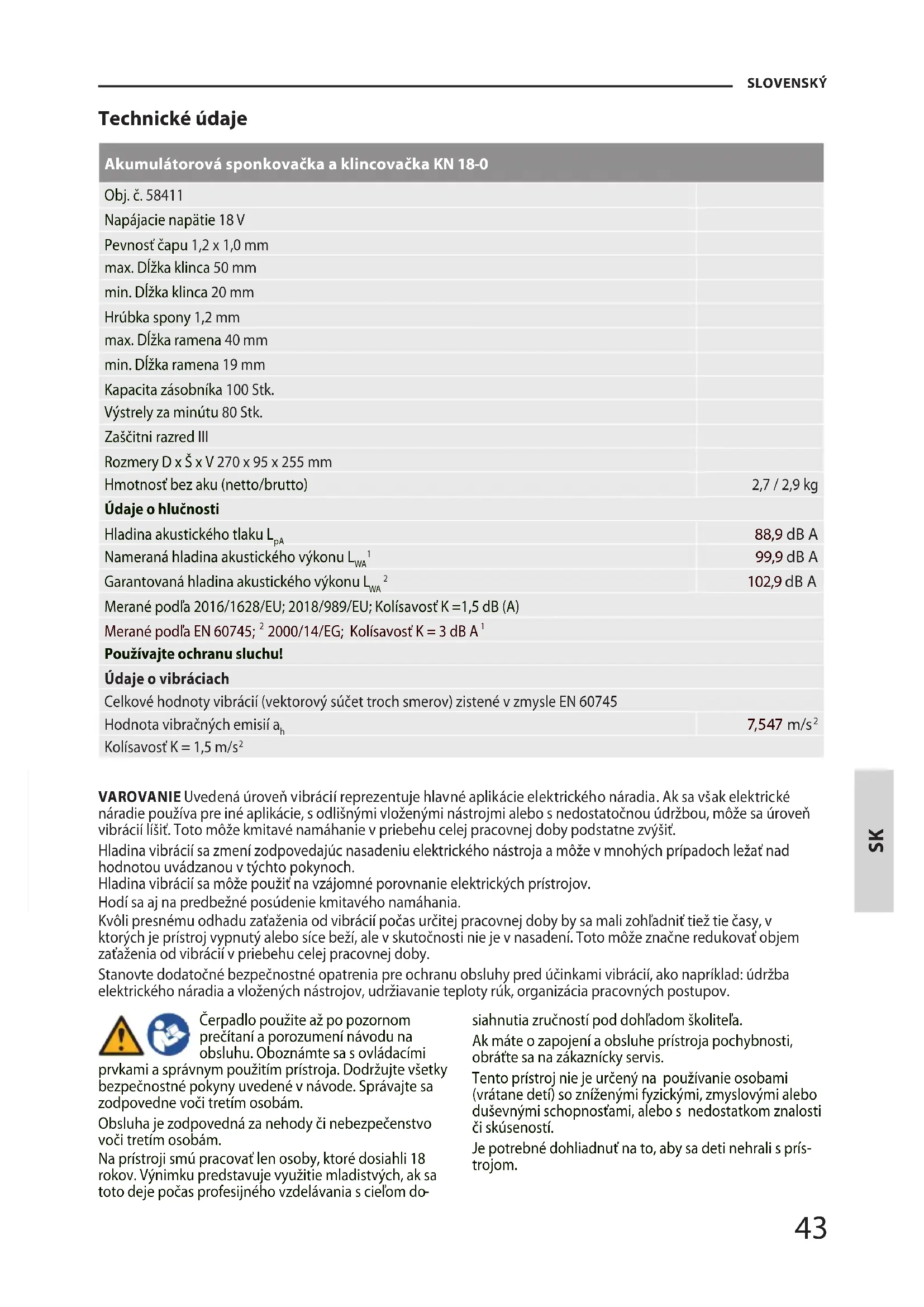 Technické údaje Akumulátorová sponkovačka a klincovačka KN 18-0 Obj. č. 58411 Napájacie napätie 18 V Pevnosť čapu 1,2 x 1,0 mm max. Dĺžka klinca 50 mm min. Dĺžka klinca 20 mm Hrúbka spony 1,2 mm max. Dĺžka ramena 40 mm min. Dĺžka ramena 19 mm Kapacita zásobníka 100 Stk. Výstrely za minútu 80 Stk. Zaščitni razred III Rozmery D x Š x V 270 x 95 x 255 mm Hmotnosť bez aku (netto/brutto) 2,7 / 2,9 kg Údaje o hlučnosti Hladina akustického tlaku L