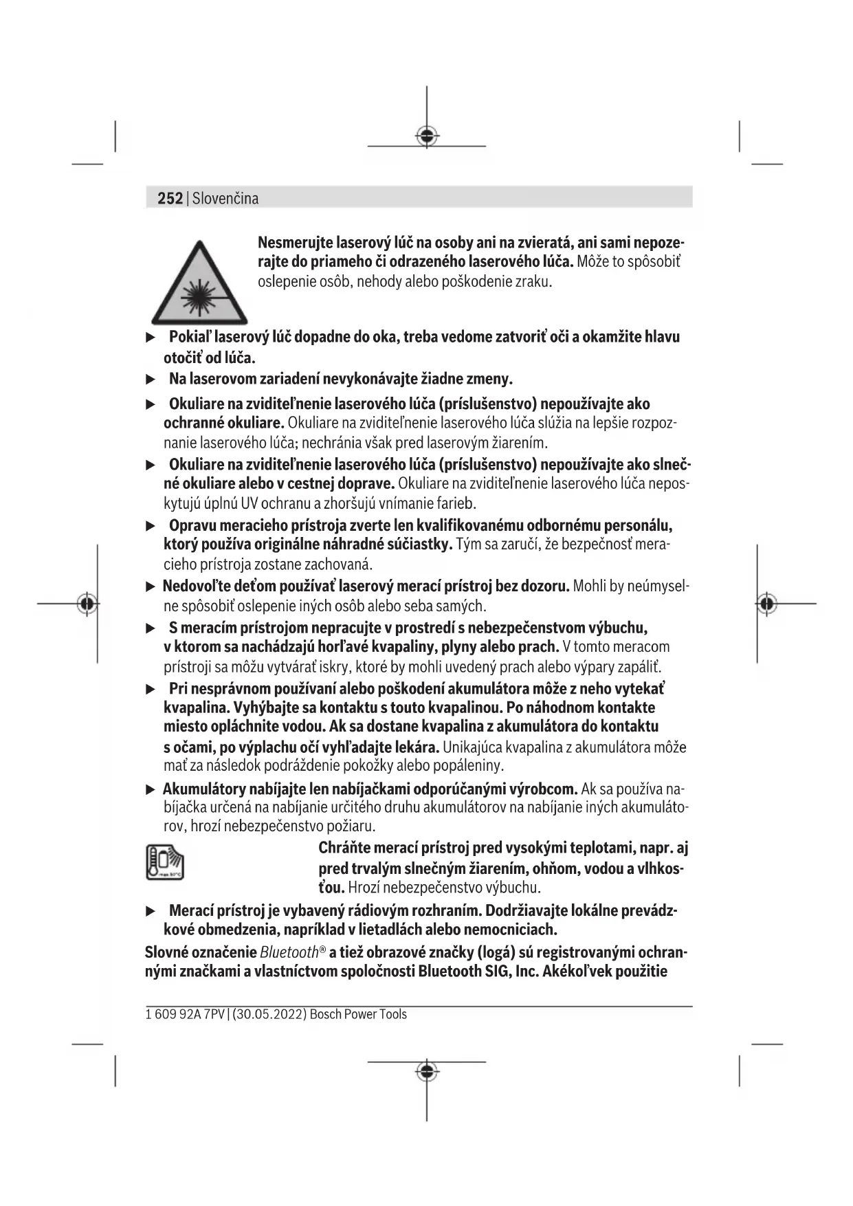 Pracovný frekvenčný rozsah 2402–2480MHz 2402–2480MHz Bosch Power Tools 1 609 92A 7PV | (30.05.2022)258 | Slovenčina Digitálny laserový diaľkomer GLM 100-25 C GLM 150-27 C Max. vysielací výkon 8mW 8mW A) Pri meraní od prednej hrany meracieho prístroja, platí pre veľmi dobré reflexné vlastnosti cieľa (napríklad nabielo natretá stena), slabé osvetlenie pozadia aprevádzkovú teplotu 25°C. Okrem toho je potrebné počítať sodchýlkou±0,05mm/m vzávislosti od vzdialenosti. B) Pri meraní od prednej hrany meracieho prístroja, platí pre veľmi dobré reflexné vlastnosti cieľa (napríklad nabielo natretá stena), silné osvetlenie pozadia aprevádzkovú teplotu 25°C apre vy- soké nadmorské výšky. Okrem toho je potrebné počítať sodchýlkou±0,15mm/m vzávislosti od vzdialenosti. C) Vo funkcii trvalého merania je max. prevádzková teplota +40°C. D) Vyskytuje sa len nevodivé znečistenie, pričom sa však príležitostne očakáva dočasná vodivosť spôsobená kondenzáciou. E) Pri prevádzkovej teplote 25°C. Čas nabíjania sUSB nabíjačkou 1 A. Rýchlejšie nabíjanie pri vy- pnutom meracom prístroji. F) Ďalšie technické údaje nájdete na adrese: https://www.bosch-professional.com/ecodesign G) Pri použití prístrojov Bluetooth® Low-Energy môže byť vzávislosti od modelu aoperačného systé- mu možné, že sa nevytvorí spojenie. Prístroje srozhraním Bluetooth® musia podporovať profil GATT. Na jednoznačnú identifikáciu vášho meracieho prístroja slúži sériové číslo(16) uvedené na typovom štítku. Vkladanie/výmena batérií