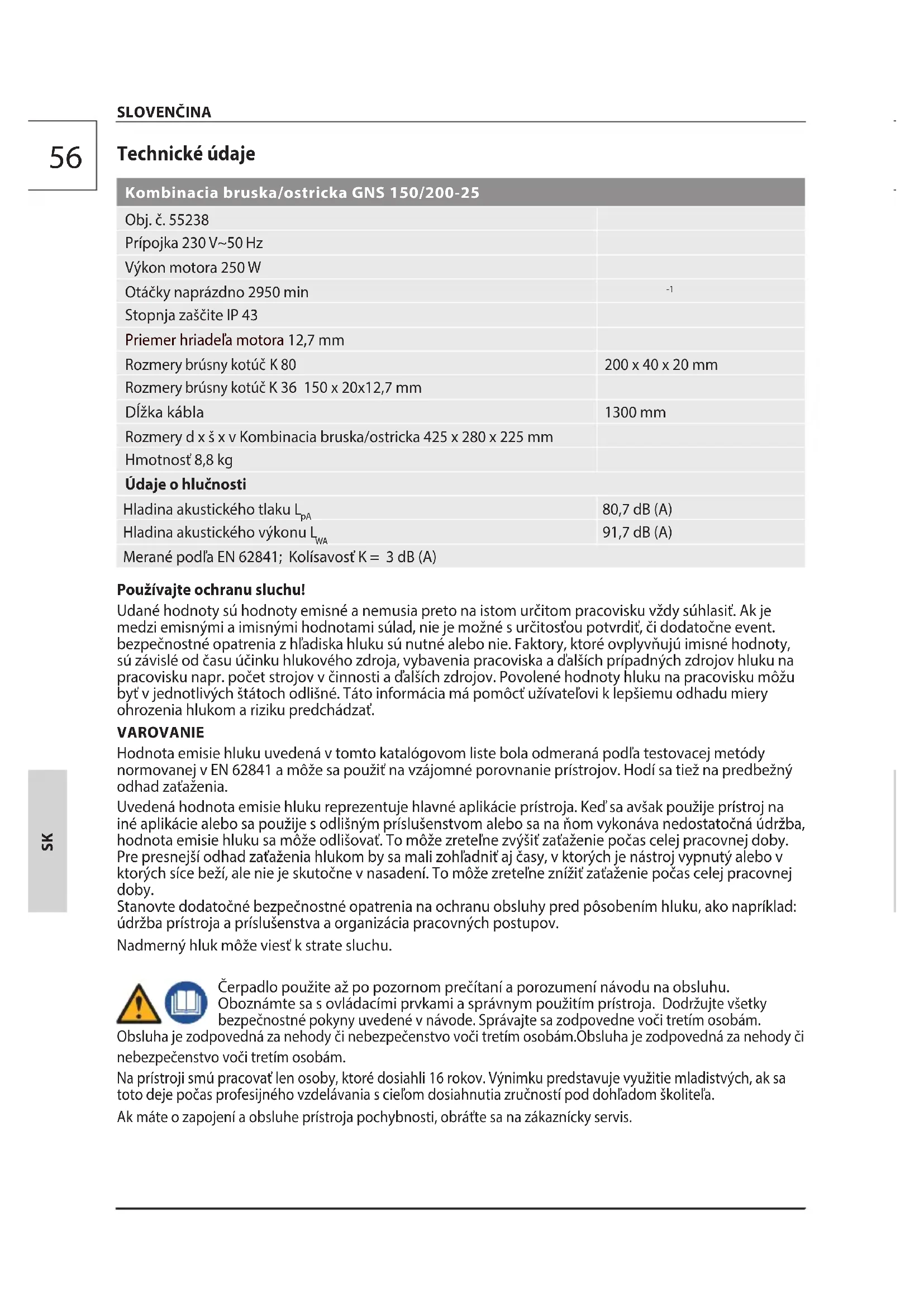 sti rotujúcich dielov prístroja. Prístroj prepravujte vždy výhradne s vytiahnutou sieťovou zástrčkou. Zabezpečte, aby prístroj stál vždy dostatočne stabilne a bezpečne. Pred každou prevádzkou vizuálne skontrolujte. Predovšetkým bezpečnostné zariadenia, elektrické ovládacie prvky, elektrické vedenia a skrutkové spoje skontrolujte z hľadiska poškodenia a utiahnutia. Pred prevádzkou taktiež v prípade potreby nahraďte poškodené diely. Elektrické náradie používajte vždy len s príslušenstvom vloženým na oboch vretenách, aby ste obmedzili riziko dotyku rotujúcich vretien. Dodržiavajte pokyny na bezpečnú realizáciu funkcií brúsenia. Poškodené alebo výrazne rozbrázdené brúsne kotúče vymeňte. V prípade blokády stroj okamžite vypnite. Sieťová Prípojka Prevádzka je povolená len s ochranným vypínačom proti chybovému prúdu (RCD max. chybový prúd30 mA). Pripájať len na jednofázový striedavý prúd a na sieťové napätie uvedené na štítku o výkonnosti. Pripájať len do zásuviek s ochranným kontaktom. Len vypnutý stroj pripájajte do zásuvky. Údrzba Pred vykonávaním akýchkoľvek prác na prístroji vždy vytiahnite zástrčku zo zásuvky. Prístroj sa nesmie používať, ak je poškodený alebo sú chybné bezpečnostné zariadenia. Opotrebené a poškodené diely vymeňte. Pozor! Ak sa poškodí napájací kábel tohto prístroja, musí ho výrobca alebo jeho zákaznícky servis či po