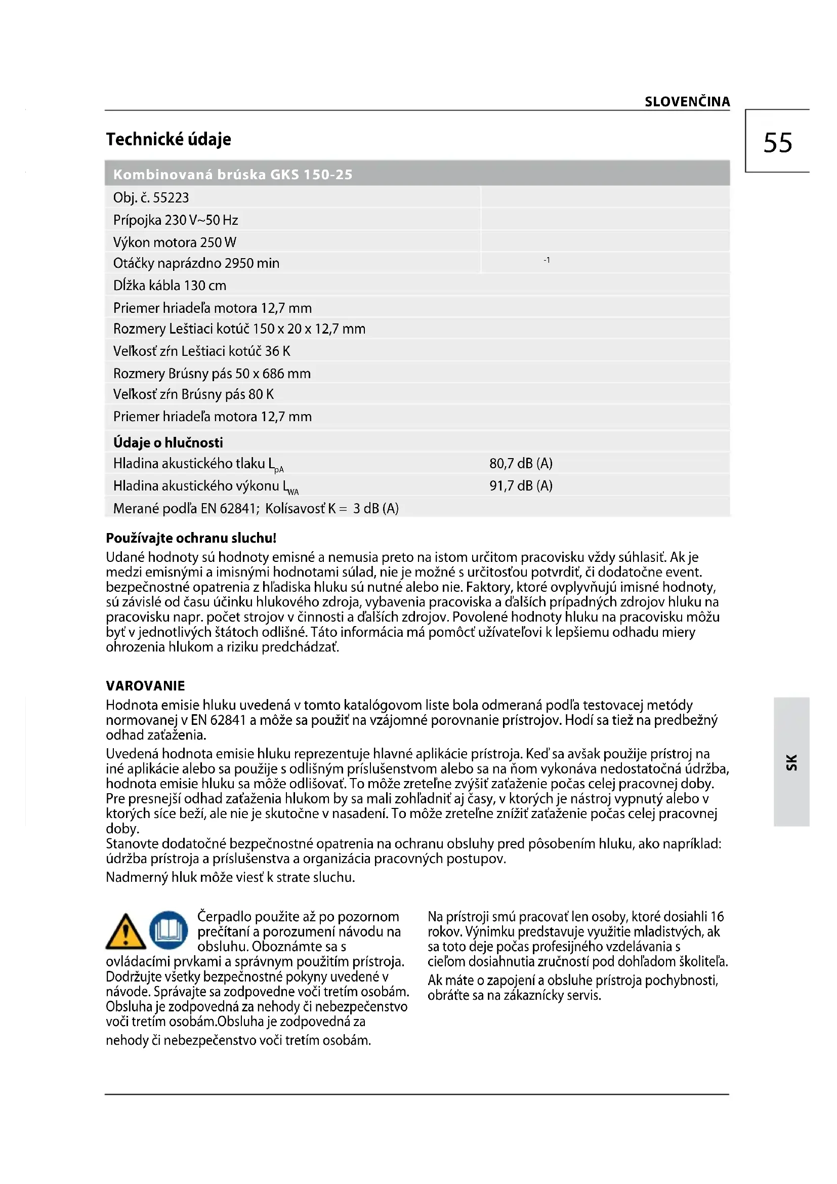 Symboly Varovanie/Pozor! Varovanie - Na zníženie rizika zranenia si prečítajte prevádzkový návod. Pred vykonávaním akýchkoľvek prác na prístroji vždy vytiahnite zástrčku zo zásuvky. Používajte ochranné okuliare! Používajte ochranu sluchu! Pri práci nosiť vhodnú ochrannú masku, aby sa nedostal do ľudského organizmu. Noste ochranné topánky. Deti a nepovolané osoby držte vždy mimo dosahu prístroja. SLOVENČINA57