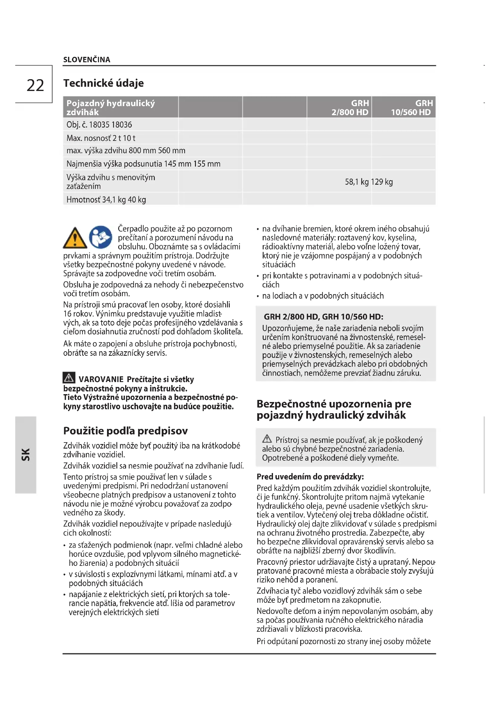 SLOVENČINA Technické údaje Pojazdný hydraulický zdvihák GRH 2/800 HD GRH 10/560 HD Obj. č. 18035 18036 Max. nosnosť 2 t 10 t max. výška zdvihu 800 mm 560 mm Najmenšia výška podsunutia 145 mm 155 mm Výška zdvihu s menovitým zaťažením 58,1 kg 129 kg Hmotnosť 34,1 kg 40 kg Čerpadlo použite až po pozornom prečítaní a porozumení návodu na obsluhu. Oboznámte sa s ovládacími prvkami a správnym použitím prístroja. Dodržujte všetky bezpečnostné pokyny uvedené v návode. Správajte sa zodpovedne voči tretím osobám. Obsluha je zodpovedná za nehody či nebezpečenstvo voči tretím osobám. Na prístroji smú pracovať len osoby, ktorédosiahli 16 rokov. Výnimku predstavuje využitie mladist