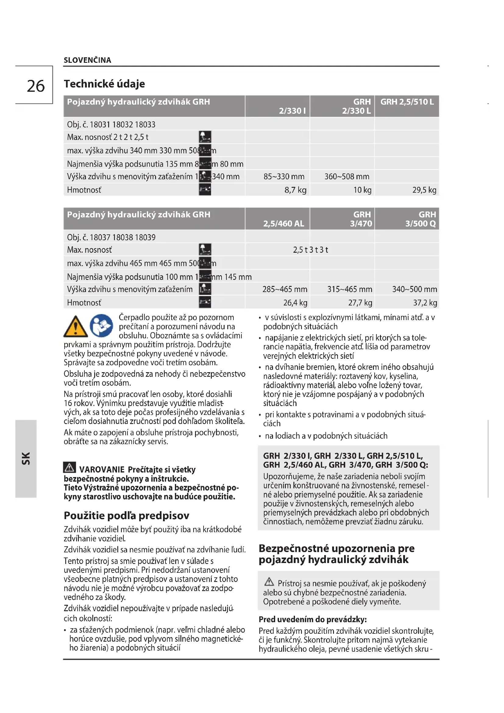 SLOVENČINA Technické údaje Pojazdný hydraulický zdvihák GRH 2/330 I GRH 2/330 L GRH 2,5/510 L Obj. č. 18031 18032 18033 Max. nosnosť 2 t 2 t 2,5 t max. výška zdvihu 340 mm 330 mm 508 mm Najmenšia výška podsunutia 135 mm 85 mm 80 mm Výška zdvihu s menovitým zaťažením 135~340 mm 85~330 mm 360~508 mm Hmotnosť 8,7 kg 10 kg 29,5 kg Pojazdný hydraulický zdvihák GRH 2,5/460 AL GRH 3/470 GRH 3/500 Q Obj. č. 18037 18038 18039 Max. nosnosť 2,5 t 3 t 3 t max. výška zdvihu 465 mm 465 mm 500 mm Najmenšia výška podsunutia 100 mm 130 mm 145 mm Výška zdvihu s menovitým zaťažením 285~465 mm 315~465 mm 340~500 mm Hmotnosť 26,4 kg 27,7 kg 37,2 kg Čerpadlo použite až po pozornom prečítaní a porozumení návodu na obsluhu. Oboznámte sa s ovládacími prvkami a správnym použitím prístroja. Dodržujte všetky bezpečnostné pokyny uvedené v návode. Správajte sa zodpovedne voči tretím osobám. Obsluha je zodpovedná za nehody či nebezpečenstvo voči tretím osobám. Na prístroji smú pracovať len osoby, ktorédosiahli 16 rokov. Výnimku predstavuje využitie mladist