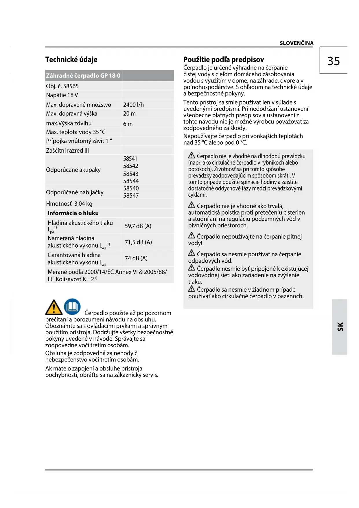 Čerpadlo použite až po pozornom prečítaní a porozumení návodu na obsluhu. Oboznámte sa s ovládacími prvkami a správnym použitím prístroja. Dodržujte všetky bezpečnostné pokyny uvedené v návode. Správajte sa zodpovedne voči tretím osobám. Obsluha je zodpovedná za nehody či nebezpečenstvo voči tretím osobám. Ak máte o zapojení a obsluhe prístroja pochybnosti, obráťte sa na zákaznícky servis. Použitie podľa predpisov Čerpadlo je určené výhradne na čerpanie čistej vody s cieľom domáceho zásobovania vodou s využitím v dome, na záhrade, dvore a v poľnohospodárstve. S ohľadom na technické údaje a bezpečnostné pokyny. Tento prístroj sa smie použivať len v súlade s uvedenými predpismi. Pri nedodržaní ustanovení všeobecne platných predpisov a ustanovení z tohto návodu nie je možné výrobcu považovať za zodpovedného za škody. Nepoužívajte čerpadlo pri vonkajších teplotách nad 35 °C alebo pod 0 °C. Čerpadlo nie je vhodné na dlhodobú prevádzku (napr. ako cirkulačné čerpadlo v rybníkoch alebo potokoch). Životnosť sa pri tomto spôsobe prevádzky zodpovedajúcim spôsobom skráti. V tomto prípade použite spínacie hodiny a zaistite dostatočné oddychové fázy medzi prevádzkovými cyklami. Čerpadlo nie je vhodné ako trvalá, automatická poistka proti pretečeniu cisterien a studní ani na reguláciu podzemných vôd v pivničných priestoroch. Čerpadlo nepoužívajte na čerpanie pitnej vody! Čerpadlo sa nesmie používať na čerpanie odpadových vôd. Čerpadlo nesmie byť pripojené k existujúcej vodovodnej sieti ako zariadenie na zvýšenie tlaku. Čerpadlo sa nesmie v žiadnom prípade používať ako cirkulačné čerpadlo v bazénoch.D