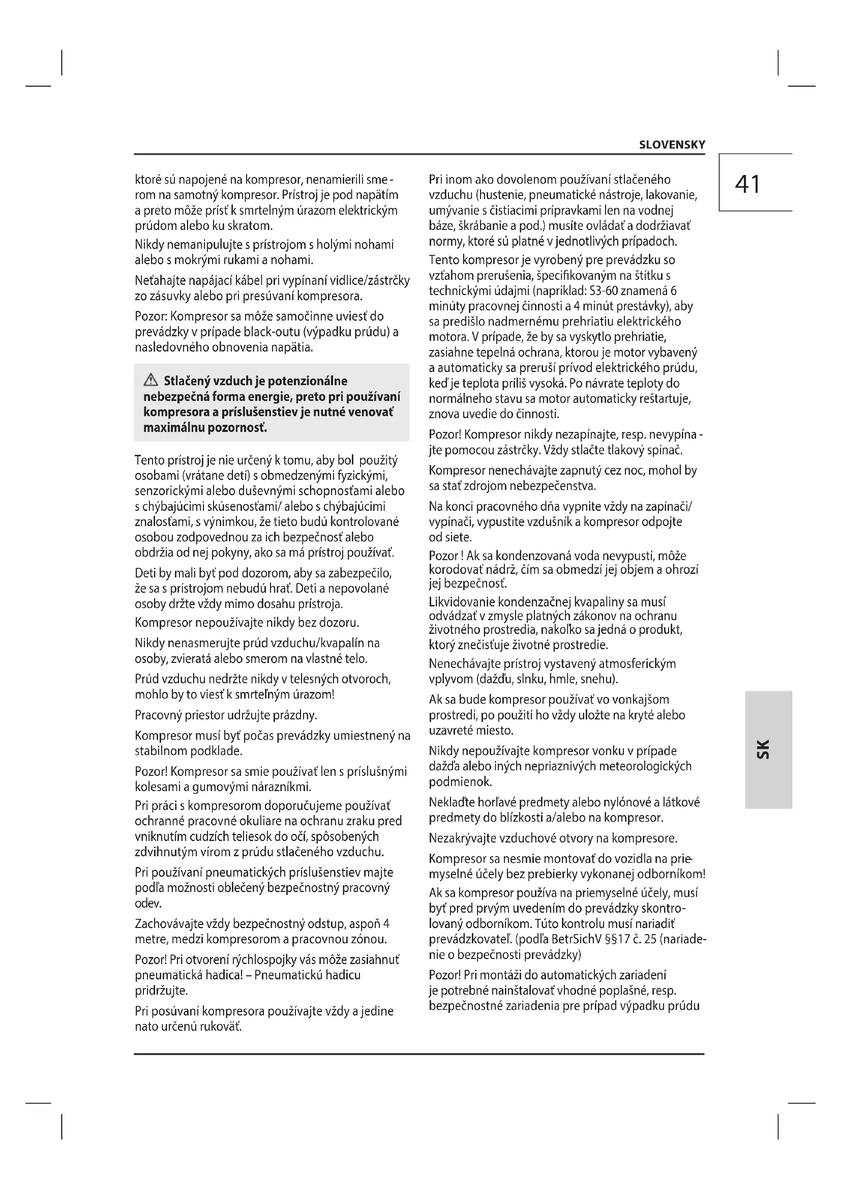rom na samotný kompresor. Prístroj je pod napätím a preto môže prísť k smrtelným úrazom elektrickým prúdom alebo ku skratom. Nikdy nemanipulujte s prístrojom s holými nohami alebo s mokrými rukami a nohami. Neťahajte napájací kábel pri vypínaní vidlice/zástrčky zo zásuvky alebo pri presúvaní kompresora. Pozor: Kompresor sa môže samočinne uviesť do prevádzky v prípade black-outu (výpadku prúdu) a nasledovného obnovenia napätia. Stlačený vzduch je potenzionálne nebezpečná forma energie, preto pri používaní kompresora a príslušenstiev je nutné venovať maximálnu pozornosť. Tento prístroj je nie určený k tomu, aby bol použitý osobami (vrátane detí) s obmedzenými fyzickými, senzorickými alebo duševnými schopnosťami alebo s chýbajúcimi skúsenosťami/ alebo s chýbajúcimi znalosťami, s výnimkou, že tieto budú kontrolované osobou zodpovednou za ich bezpečnosť alebo obdržia od nej pokyny, ako sa má prístroj používať. Deti by mali byť pod dozorom, aby sa zabezpečilo, že sa s prístrojom nebudú hrať. Deti a nepovolané osoby držte vždy mimo dosahu prístroja. Kompresor nepoužívajte nikdy bez dozoru. Nikdy nenasmerujte prúd vzduchu/kvapalín na osoby, zvieratá alebo smerom na vlastné telo. Prúd vzduchu nedržte nikdy v telesných otvoroch, mohlo by to viesť k smrteľným úrazom! Pracovný priestor udržujte prázdny. Kompresor musí byť počas prevádzky umiestnený na stabilnom podklade. Pozor! Kompresor sa smie používať len s príslušnými kolesami a gumovými nárazníkmi. Pri práci s kompresorom doporučujeme používať ochranné pracovné okuliare na ochranu zraku pred vniknutím cudzích teliesok do očí, spôsobených zdvihnutým vírom z prúdu stlačeného vzduchu. Pri používaní pneumatických príslušenstiev majte podľa možnosti oblečený bezpečnostný pracovný odev. Zachovávajte vždy bezpečnostný odstup, aspoň 4 metre, medzi kompresorom a pracovnou zónou. Pozor! Pri otvorení rýchlospojky vás môže zasiahnuť pneumatická hadica! – Pneumatickú hadicu pridržujte. Pri posúvaní kompresora používajte vždy a jedine nato určenú rukoväť. SLOVENSKY42