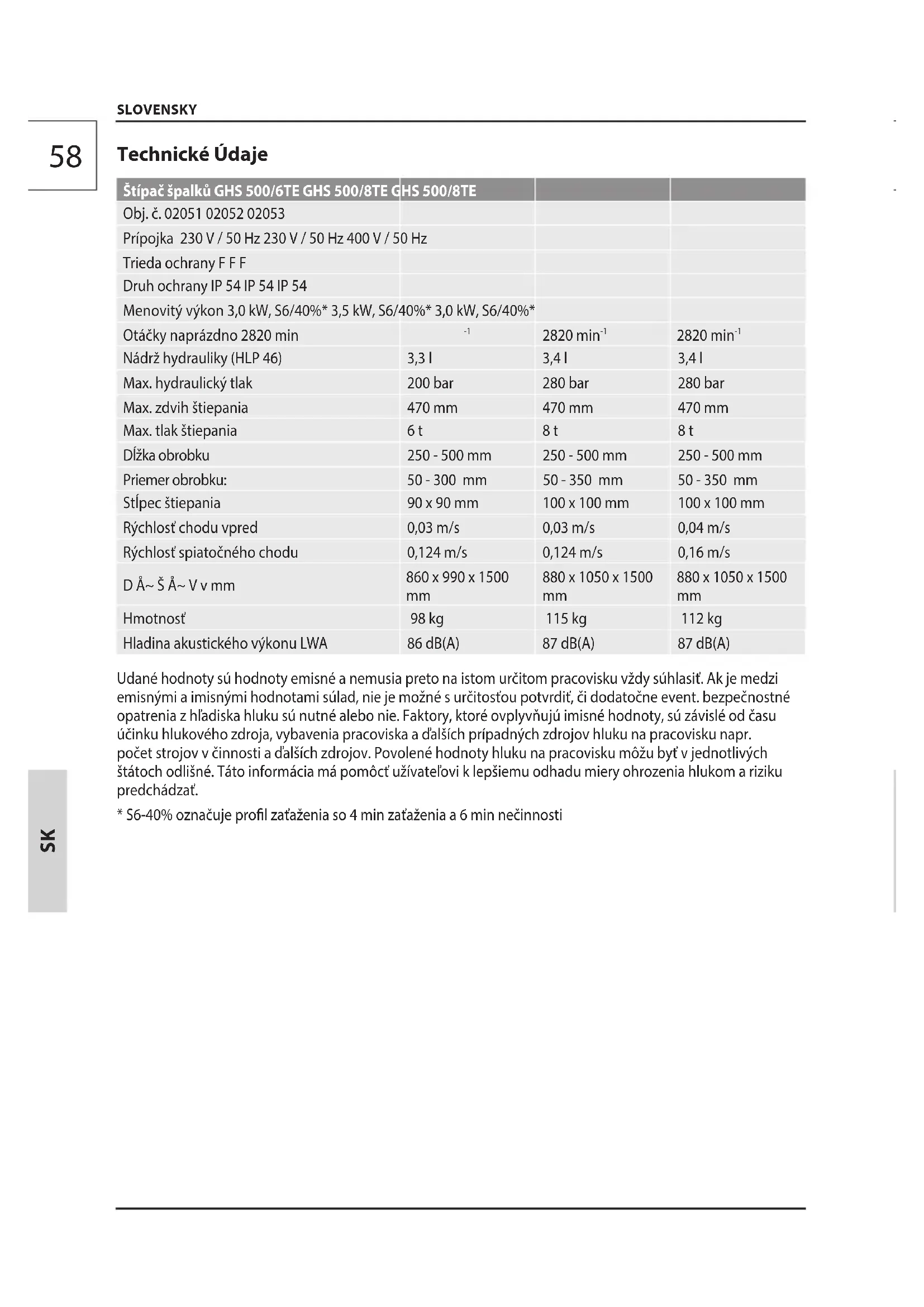 Hmotnosť 98 kg 115 kg 112 kg Hladina akustického výkonu LWA 86 dB(A) 87 dB(A) 87 dB(A) Udané hodnoty sú hodnoty emisné a nemusia preto na istom určitom pracovisku vždy súhlasiť. Ak je medzi emisnými a imisnými hodnotami súlad, nie je možné s určitosťou potvrdiť, či dodatočne event. bezpečnostné opatrenia z hľadiska hluku sú nutné alebo nie. Faktory, ktoré ovplyvňujú imisné hodnoty, sú závislé od času účinku hlukového zdroja, vybavenia pracoviska a ďalších prípadných zdrojov hluku na pracovisku napr. počet strojov v činnosti a ďalších zdrojov. Povolené hodnoty hluku na pracovisku môžu byť v jednotlivých štátoch odlišné. Táto informácia má pomôcť užívateľovi k lepšiemu odhadu miery ohrozenia hlukom a riziku predchádzať.