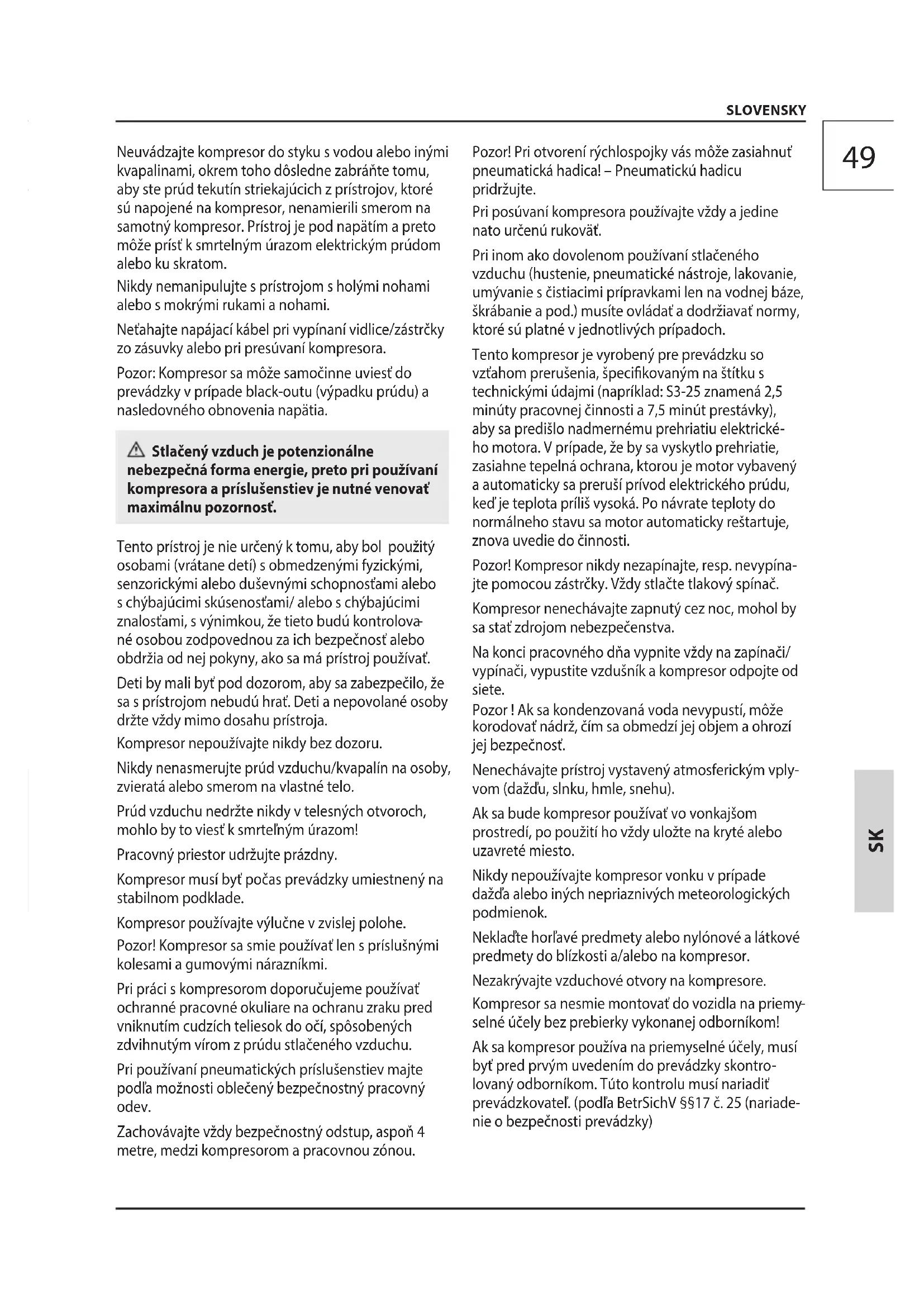 lovaný odborníkom. Túto kontrolu musí nariadiť prevádzkovateľ. (podľa BetrSichV §§17 č. 25 (nariade- nie o bezpečnosti prevádzky) Neuvádzajte kompresor do styku s vodou alebo inými kvapalinami, okrem toho dôsledne zabráňte tomu, aby ste prúd tekutín striekajúcich z prístrojov, ktoré sú napojené na kompresor, nenamierili smerom na samotný kompresor. Prístroj je pod napätím a preto môže prísť k smrtelným úrazom elektrickým prúdom alebo ku skratom. Nikdy nemanipulujte s prístrojom s holými nohami alebo s mokrými rukami a nohami. Neťahajte napájací kábel pri vypínaní vidlice/zástrčky zo zásuvky alebo pri presúvaní kompresora. Pozor: Kompresor sa môže samočinne uviesť do prevádzky v prípade black-outu (výpadku prúdu) a nasledovného obnovenia napätia. Stlačený vzduch je potenzionálne nebezpečná forma energie, preto pri používaní kompresora a príslušenstiev je nutné venovať maximálnu pozornosť. Tento prístroj je nie určený k tomu, aby bol použitý osobami (vrátane detí) s obmedzenými fyzickými, senzorickými alebo duševnými schopnosťami alebo s chýbajúcimi skúsenosťami/ alebo s chýbajúcimi znalosťami, s výnimkou, že tieto budú kontrolova