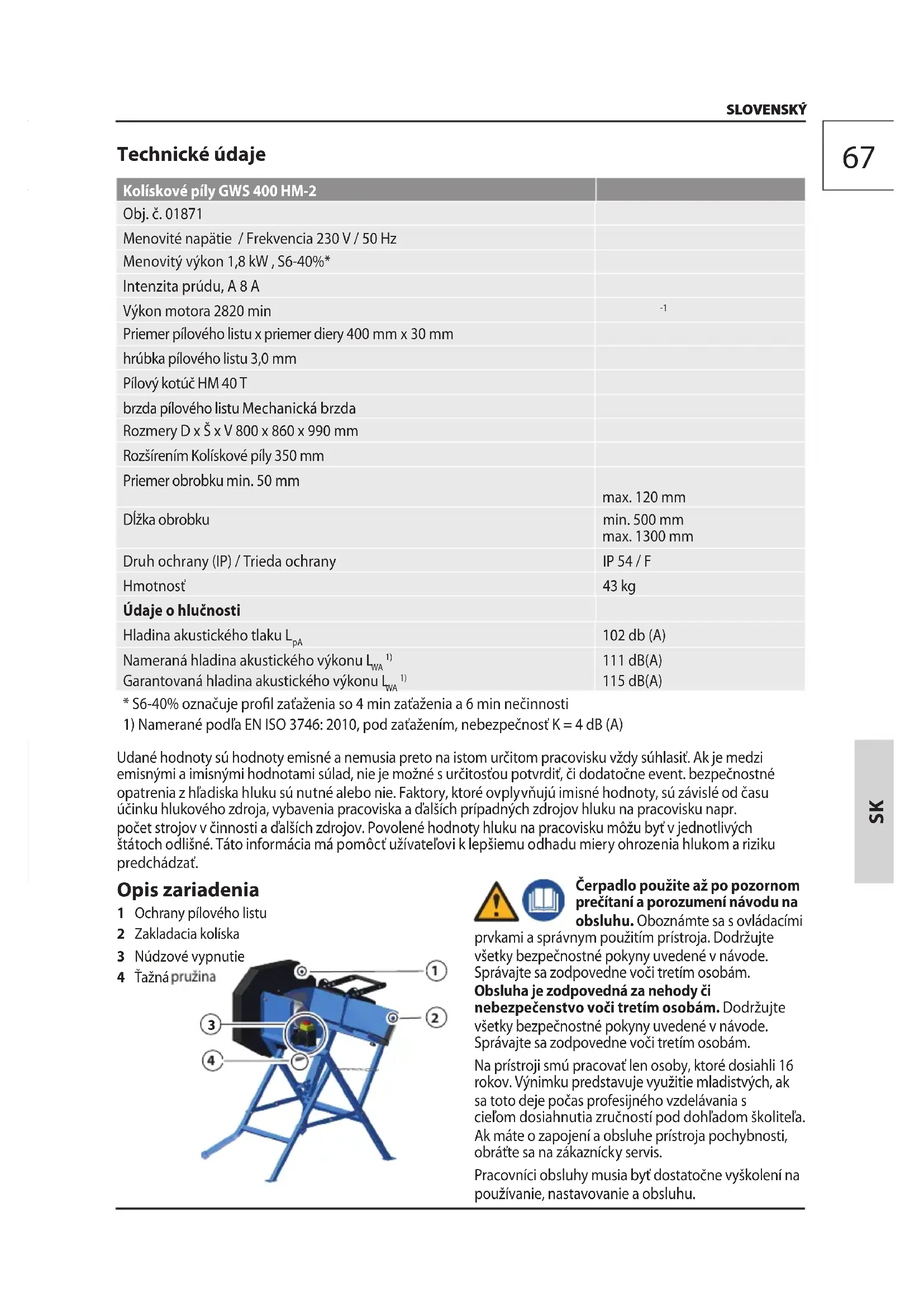 Udané hodnoty sú hodnoty emisné a nemusia preto na istom určitom pracovisku vždy súhlasiť. Ak je medzi emisnými a imisnými hodnotami súlad, nie je možné s určitosťou potvrdiť, či dodatočne event. bezpečnostné opatrenia z hľadiska hluku sú nutné alebo nie. Faktory, ktoré ovplyvňujú imisné hodnoty, sú závislé od času účinku hlukového zdroja, vybavenia pracoviska a ďalších prípadných zdrojov hluku na pracovisku napr. počet strojov v činnosti a ďalších zdrojov. Povolené hodnoty hluku na pracovisku môžu byť v jednotlivých štátoch odlišné. Táto informácia má pomôcť užívateľovi k lepšiemu odhadu miery ohrozenia hlukom a riziku predchádzať. Opis zariadenia 1 Ochrany pílového listu 2 Zakladacia kolíska 3 Núdzové vypnutie 4 Ťažná pružina