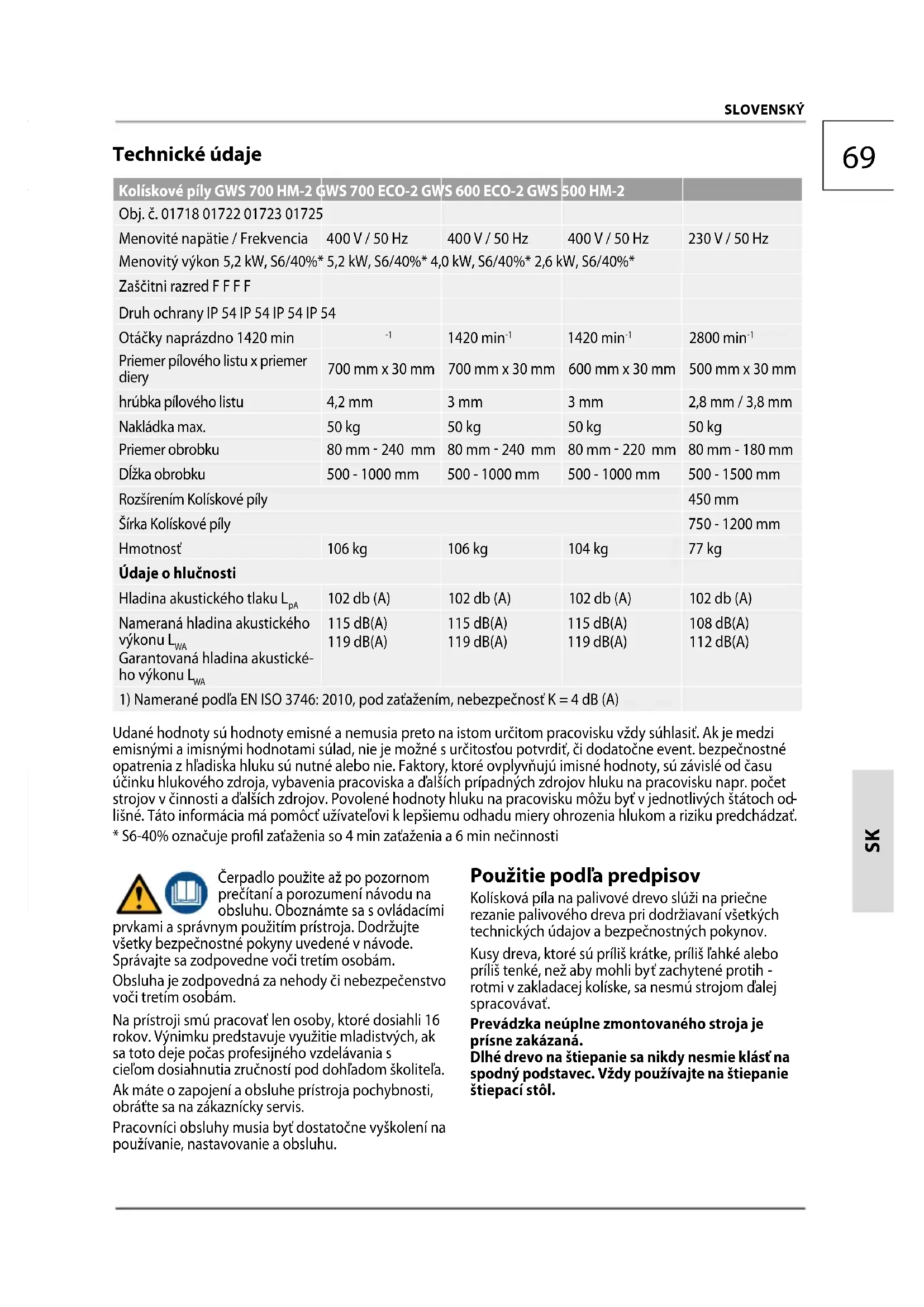 Prístroj musí byť zapojený do zásuvky 400 Vs poistkou 16 A. GWS 500 HM-2 Prístroj musí byť zapojený do zásuvky 230 Vs poistkou 16 A. Používajte ochranu sluchu. Nadmerný hluk môže viesť k strate sluchu. Noste ochranné rukavice pri manipulácii s pílovými listami a drsnými materiálmi. Stroj musí stáť počas prevádzky na vodorovnej a rovnej zemi a podlaha okolo stroja musí byť rovná, dobre udržiavaná a bez odpadov, ako sú napr. piliny a odrezky. Spracovávaný stoh obrobkov a hotové obrobky um