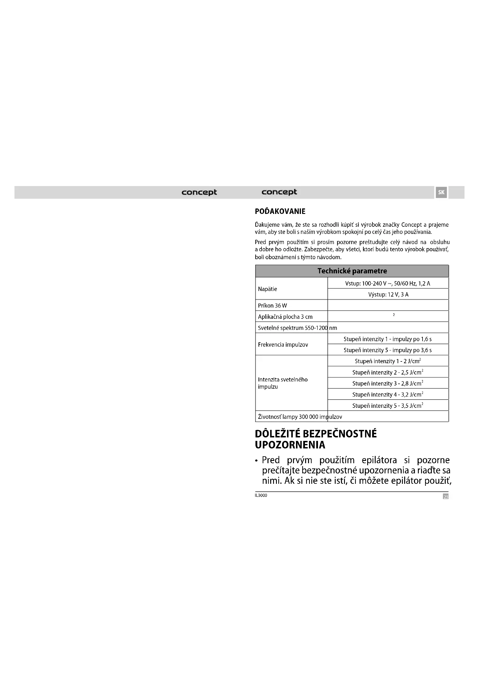 IL3000 POĎAKOVANIE Ďakujeme vám, že ste sa rozhodli kúpiť si výrobok značky Concept a prajeme vám, aby ste boli s naším výrobkom spokojní po celý čas jeho používania. Pred prvým použitím si prosím pozorne preštudujte celý návod na obsluhu adobre ho odložte. Zabezpečte, aby všetci, ktorí budú tento výrobok používať, boli oboznámení stýmto návodom. Technické parametre Napätie Vstup: 100-240 V ~, 50/60 Hz, 1,2 A Výstup: 12 V, 3 A Príkon 36 W Aplikačná plocha 3 cm