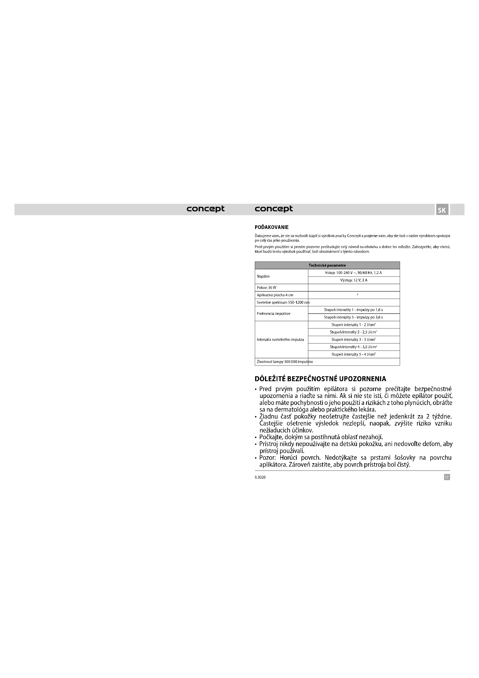 IL3020 POĎAKOVANIE Ďakujeme vám, že ste sa rozhodli kúpiť si výrobok značky Concept a prajeme vám, aby ste boli s naším výrobkom spokojní po celý čas jeho používania. Pred prvým použitím si prosím pozorne preštudujte celý návod naobsluhu a dobre ho odložte. Zabezpečte, aby všetci, ktorí budú tento výrobok používať, boli oboznámení stýmto návodom. Technické parametre Napätie Vstup: 100-240 V ~, 50/60 Hz, 1,2 A Výstup: 12 V, 3 A Príkon 36 W Aplikačná plocha 4 cm