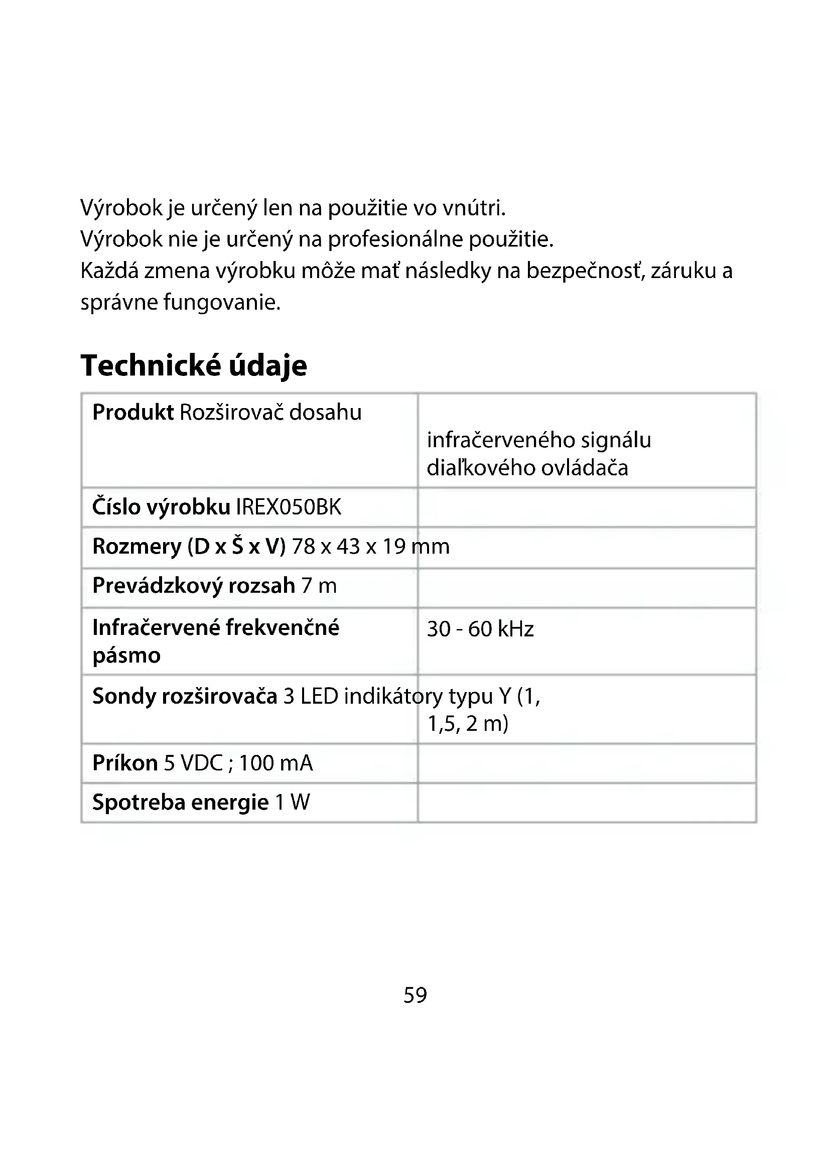 Rýchly návod Rozširovač dosahu infračerveného signálu diaľkového ovládača IREX050BK Viac informácií nájdete v rozšírenom návode online:ned.is/irex050bk Určené použitie Tento výrobok zosilňuje a rozširuje pôsobenie infračerveného signálu z diaľkového ovládača do zariadenia pripojeného k tomuto výrobku, aj keď sú vaše zariadenia skryté.59 Výrobok je určený len na použitie vo vnútri. Výrobok nie je určený na profesionálne použitie. Každá zmena výrobku môže mať následky na bezpečnosť, záruku a správne fungovanie. Technické údaje Produkt Rozširovač dosahu infračerveného signálu diaľkového ovládača Číslo výrobku IREX050BK Rozmery (D x Š x V) 78 x 43 x 19 mm Prevádzkový rozsah 7 m Infračervené frekvenčné pásmo