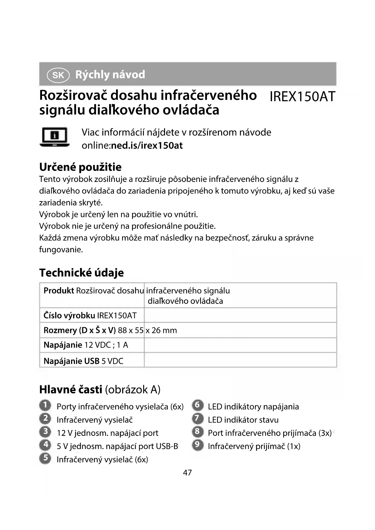 Rýchly návod Rozširovač dosahu infračerveného signálu diaľkového ovládača IREX150AT Viac informácií nájdete v rozšírenom návode online:ned.is/irex150at Určené použitie Tento výrobok zosilňuje a rozširuje pôsobenie infračerveného signálu z diaľkového ovládača do zariadenia pripojeného k tomuto výrobku, aj keď sú vaše zariadenia skryté. Výrobok je určený len na použitie vo vnútri. Výrobok nie je určený na profesionálne použitie. Každá zmena výrobku môže mať následky na bezpečnosť, záruku a správne fungovanie. Technické údaje Produkt Rozširovač dosahu infračerveného signálu diaľkového ovládača Číslo výrobku IREX150AT Rozmery (D x Š x V) 88 x 55 x 26 mm Napájanie 12 VDC ; 1 A Napájanie USB 5 VDC Hlavné časti (obrázok A)