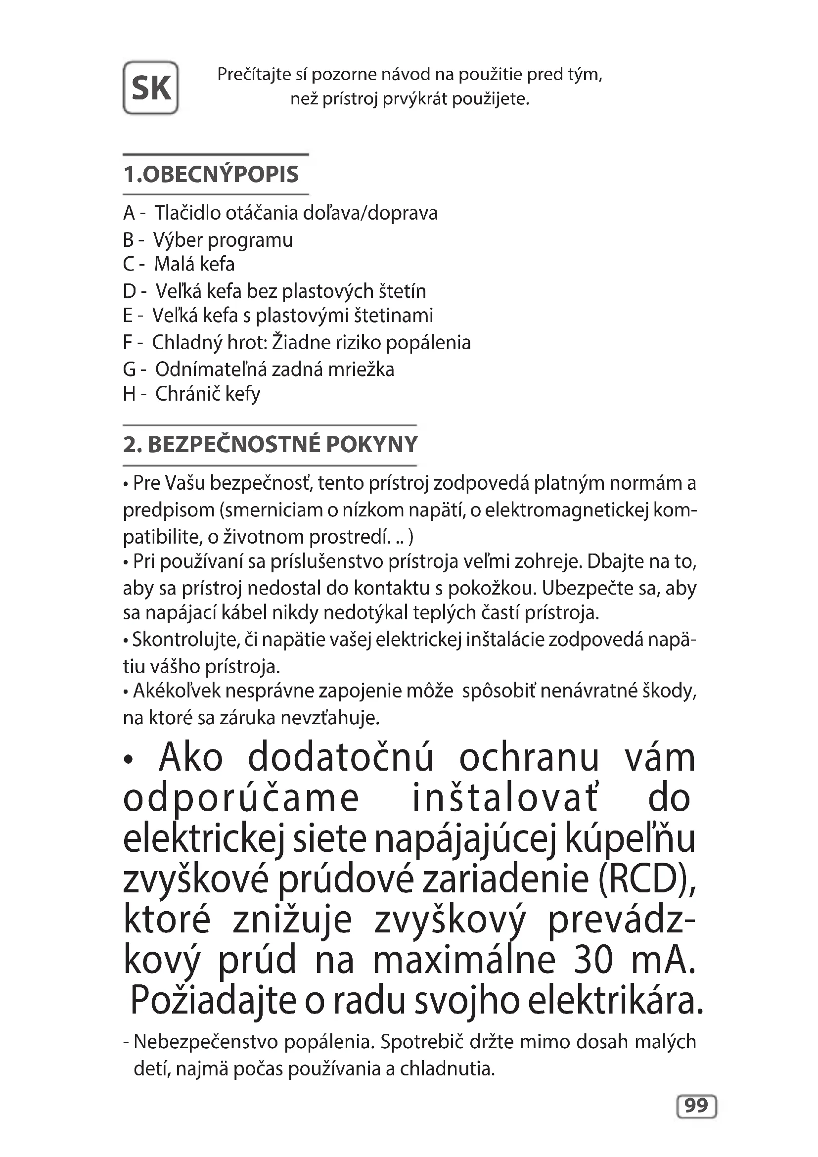 A - Tlačidlo otáčania doľava/doprava B - Výber programu C - Malá kefa D - Veľká kefa bez plastových štetín E - Veľká kefa s plastovými štetinami F - Chladný hrot: Žiadne riziko popálenia G - Odnímateľná zadná mriežka H - Chránič kefy
