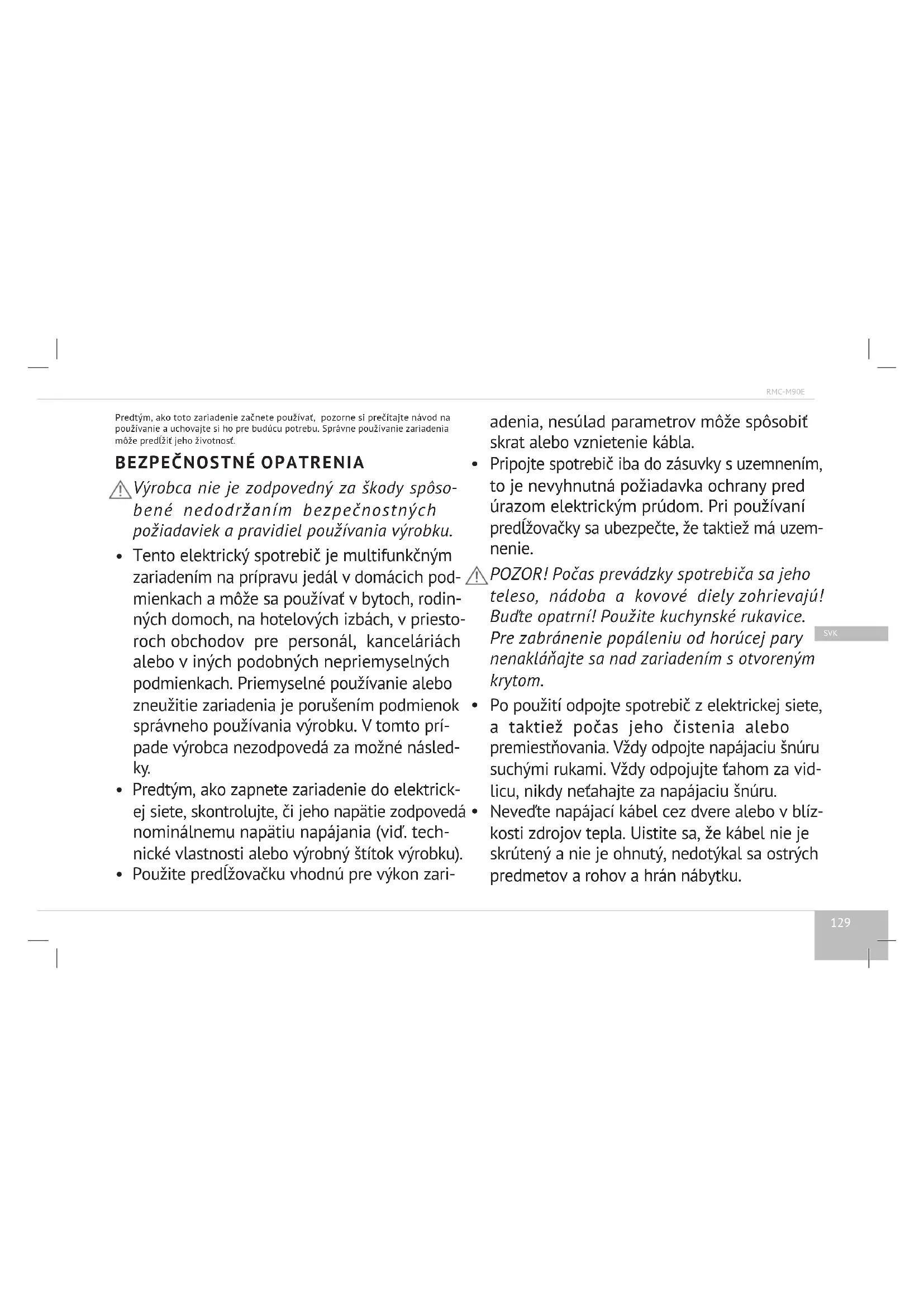 Tento elektrický spotrebič je multifunkčným zariadením na prípravu jedál vdomácich pod- mienkach amôže sa používať vbytoch, rodin- ných domoch, na hotelových izbách, v priesto- roch obchodov pre personál, kanceláriách alebo v iných podobných nepriemyselných podmienkach. Priemyselné používanie alebo zneužitie zariadenia je porušením podmienok správneho používania výrobku. Vtomto prí- pade výrobca nezodpovedá za možné násled- ky.