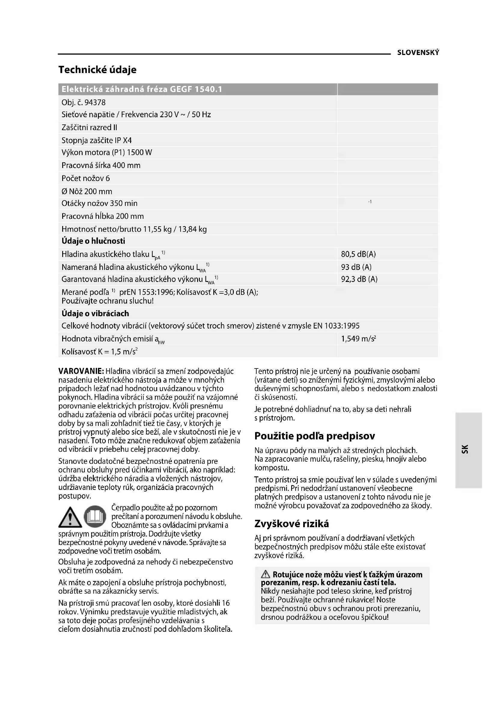 VAROVANIE: Hladina vibrácií sa zmení zodpovedajúc nasadeniu elektrického nástroja a môže v mnohých prípadoch ležať nad hodnotou uvádzanou v týchto pokynoch. Hladina vibrácií sa môže použiť na vzájomné porovnanie elektrických prístrojov. Kvôli presnému odhadu zaťaženia od vibrácií počas určitej pracovnej doby by sa mali zohľadniť tiež tie časy, v ktorých je prístroj vypnutý alebo síce beží, ale v skutočnosti nie je v nasadení. Toto môže značne redukovať objem zaťaženia od vibrácií v priebehu celej pracovnej doby. Stanovte dodatočné bezpečnostné opatrenia pre ochranu obsluhy pred účinkami vibrácií, ako napríklad: údržba elektrického náradia a vložených nástrojov, udržiavanie teploty rúk, organizácia pracovných postupov. Čerpadlo použite až po pozornom prečítaní a porozumení návodu k obsluhe. Oboznámte sa s ovládacími prvkami a správnym použitím prístroja. Dodržujte všetky bezpečnostné pokyny uvedené v návode. Správajte sa zodpovedne voči tretím osobám. Obsluha je zodpovedná za nehody či nebezpečenstvo voči tretím osobám. Ak máte o zapojení a obsluhe prístroja pochybnosti, obráťte sa na zákaznícky servis. Na prístroji smú pracovať len osoby, ktorédosiahli 16 rokov. Výnimku predstavuje využitie mladistvých,ak sa toto deje počas profesijného vzdelávania s cieľomdosiahnutia zručností pod dohľadom školiteľa. Tento prístroj nie je určený na používanie osobami (vrátane detí) so zníženými fyzickými, zmyslovými alebo duševnými schopnosťami, alebo s nedostatkom znalosti či skúseností. Je potrebné dohliadnuť na to, aby sa deti nehrali sprístrojom. Použitie podľa predpisov Na úpravu pôdy na malých až stredných plochách. Na zapracovanie mulču, rašeliny, piesku, hnojív alebo kompostu. Tento prístroj sa smie použivať len v súlade s uvedenými predpismi. Pri nedodržaní ustanovení všeobecne platných predpisov a ustanovení z tohto návodu nie je možné výrobcu považovať za zodpovedného za škody. Zvyškové riziká Aj pri správnom používaní a dodržiavaní všetkých bezpečnostných predpisov môžu stále ešte existovať zvyškové riziká. Rotujúce nože môžu viesť kťažkým úrazom porezaním, resp. k odrezaniu častí tela. Nikdy nesiahajte pod teleso skrine, keď prístroj beží. Používajte ochranné rukavice! Noste bezpečnostnú obuv s ochranou proti prerezaniu, drsnou podrážkou a oceľovou špičkou! SLOVENSKÝ52 53
