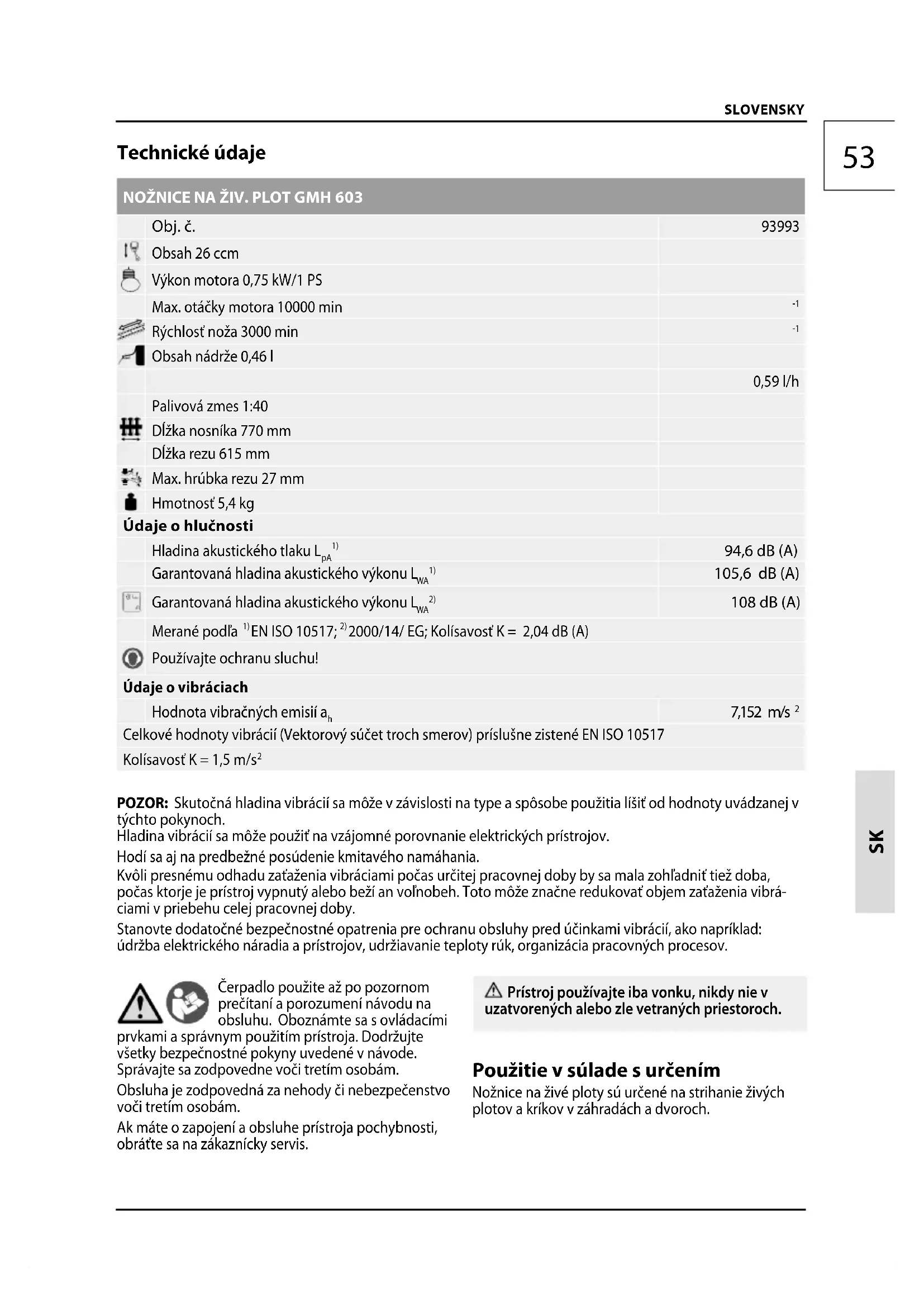 Obsah nádrže 0,46 l 0,59 l/h Palivová zmes 1:40 Dĺžka nosníka 770 mm Dĺžka rezu 615 mm Max. hrúbka rezu 27 mm Hmotnosť 5,4 kg Údaje o hlučnosti Hladina akustického tlaku L