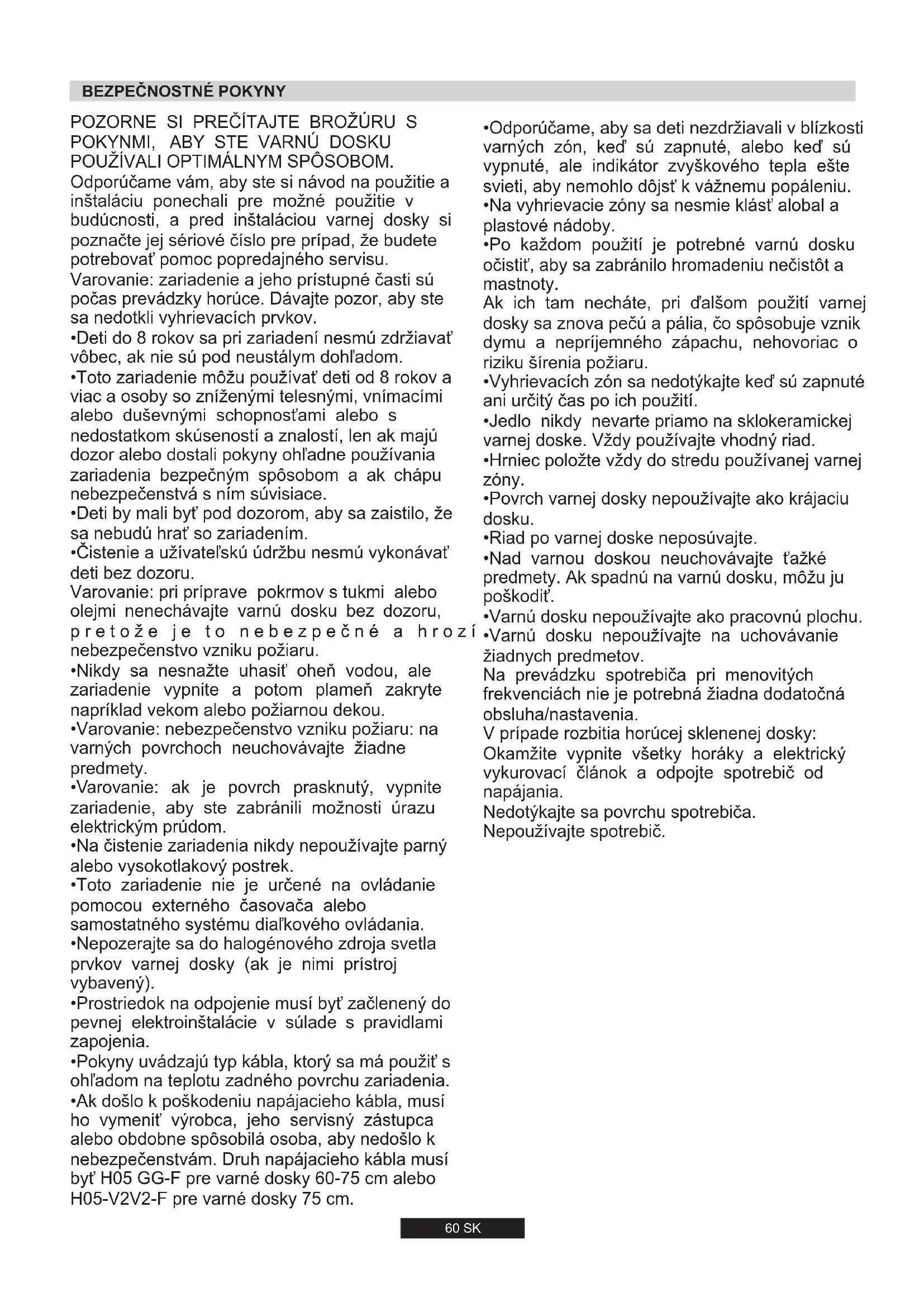- Ak došlo k poškodeniu napájacieho kábla, musí ho vymeniť výrobca, jeho servisný zástupca alebo obdobne spôsobilá osoba, aby nedošlo k nebezpečenstvám. Druh napájacieho kábla musí byť H05 GG-F pre varné dosky 60-75 cm alebo H05-V2V2-F pre varné dosky 75 cm.