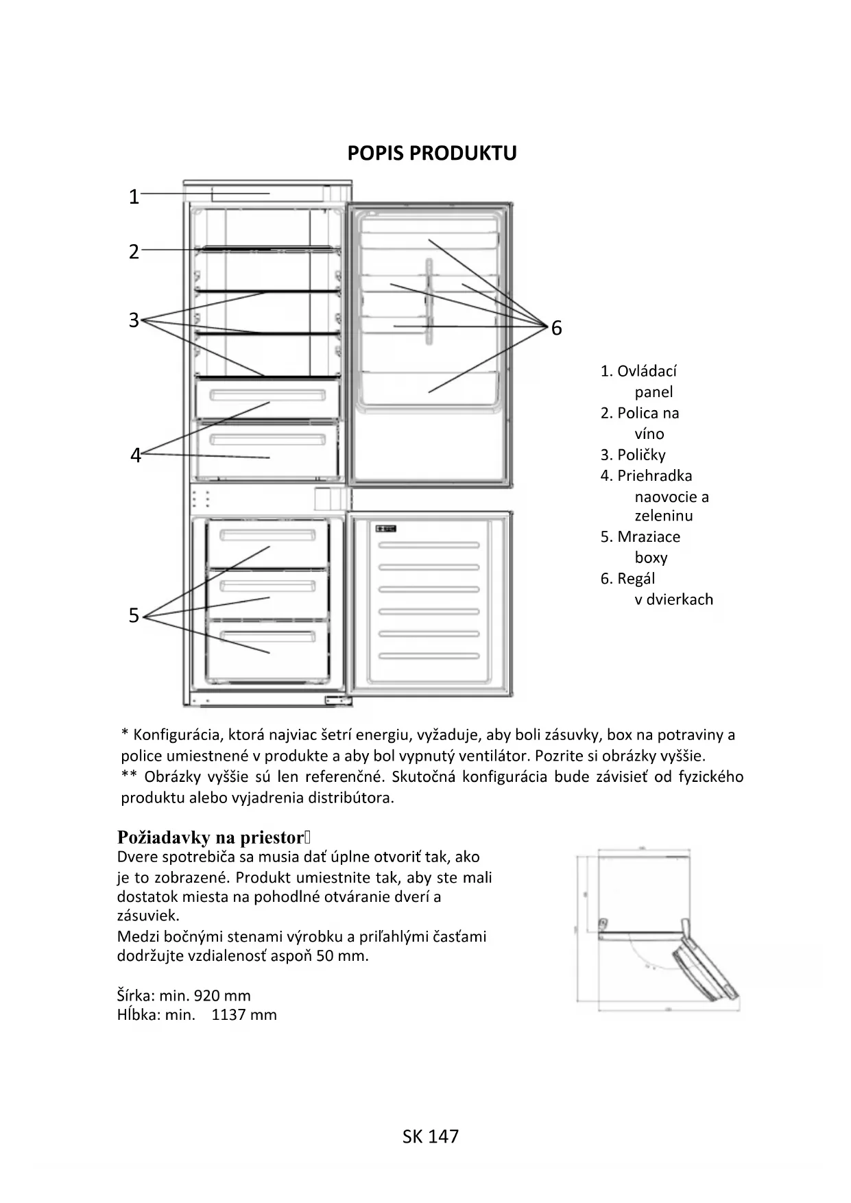 - Konfigurácia, ktorá najviac šetrí energiu, vyžaduje, aby boli zásuvky, box na potraviny a police umiestnené v produkte a aby bol vypnutý ventilátor. Pozrite si obrázky vyššie. ** Obrázky vyššie sú len referenčné. Skutočná konfigurácia bude závisieť od fyzického produktu alebo vyjadrenia distribútora.Požiadavky na priestorDvere spotrebiča sa musia dať úplne otvoriť tak, ako je to zobrazené. Produkt umiestnite tak, aby ste mali dostatok miesta na pohodlné otváranie dverí a zásuviek. Medzi bočnými stenami výrobku a priľahlými časťami dodržujte vzdialenosť aspoň 50 mm.Šírka: min. 920 mmHĺbka: min. 1137 mm1. Ovládacípanel2. Polica na víno