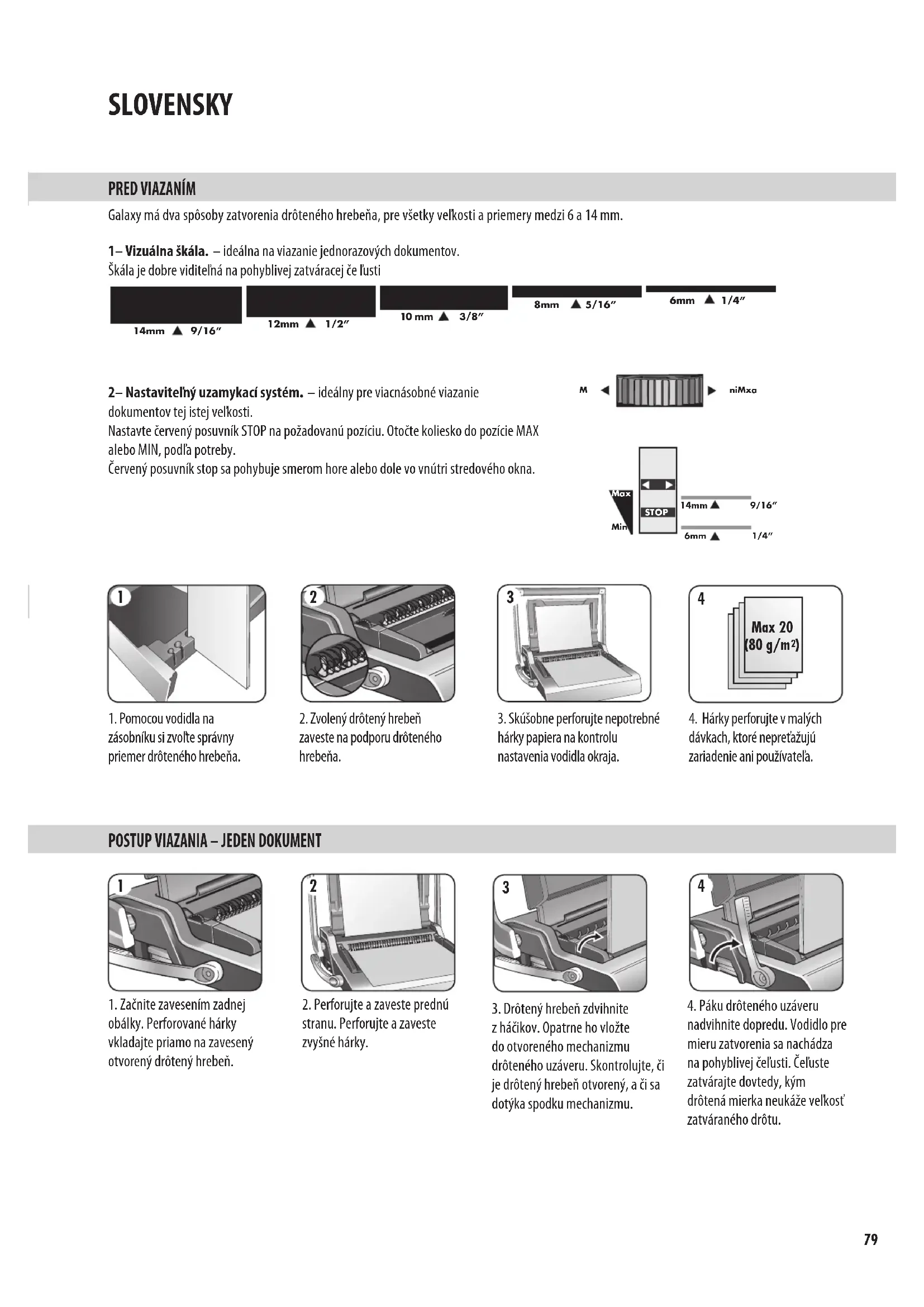 na pevnom povrchu. 1 2SLOVENSKY Galaxy má dva spôsoby zatvorenia drôteného hrebeňa, pre všetky veľkosti a priemery medzi 6 a 14 mm. 1– Vizuálna škála. – ideálna na viazanie jednorazových dokumentov. Škála je dobre viditeľná na pohyblivej zatváracej če ľusti 6mm 1/4”8mm 5/16”10 mm 3/8”12mm 1/2”14mm 9/16” 2– Nastaviteľný uzamykací systém. – ideálny pre viacnásobné viazanie dokumentov tej istej veľkosti. Nastavte červený posuvník STOP na požadovanú pozíciu. Otočte koliesko do pozície MAX alebo MIN, podľa potreby. Červený posuvník stop sa pohybuje smerom hore alebo dole vo vnútri stredového okna.