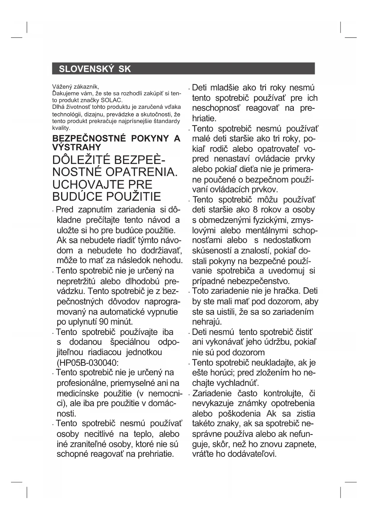 - Tento spotrebič nie je určený na nepretržitú alebo dlhodobú pre- vádzku. Tento spotrebič je z bez- pečnostných dôvodov naprogra- movaný na automatické vypnutie po uplynutí 90 minút.