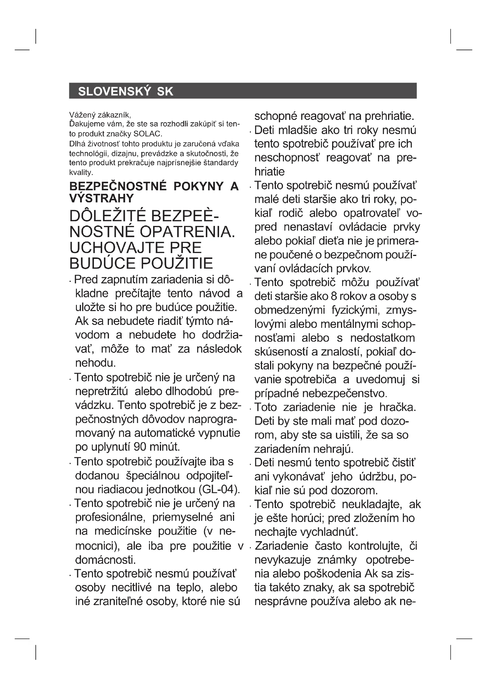 - Tento spotrebič nesmú používať osoby necitlivé na teplo, alebo iné zraniteľné osoby, ktoré nie sú schopné reagovať na prehriatie.
