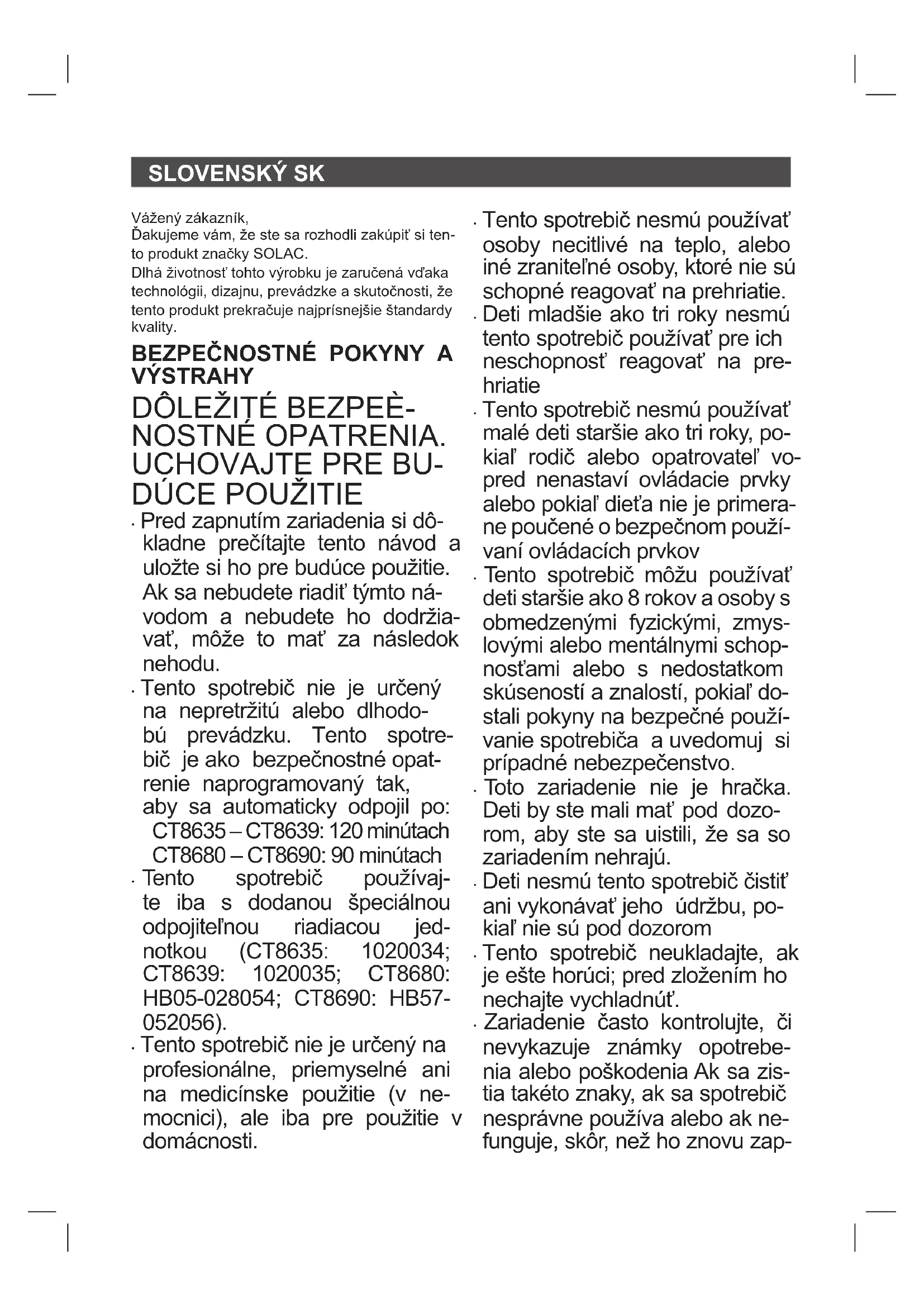 - Tento spotrebič je ako bezpečnostné opatrenie naprogramovaný tak, aby sa automaticky vypol po: 120 min (CT8635- CT8639) a 90 min. (CT8680 – CT8690) nepretržitého používania. Ak sa zariadenie vyplo týmto spôsobom, opä- tovne stlačte tlačidlo napájania, aby sa znova zohrialo.