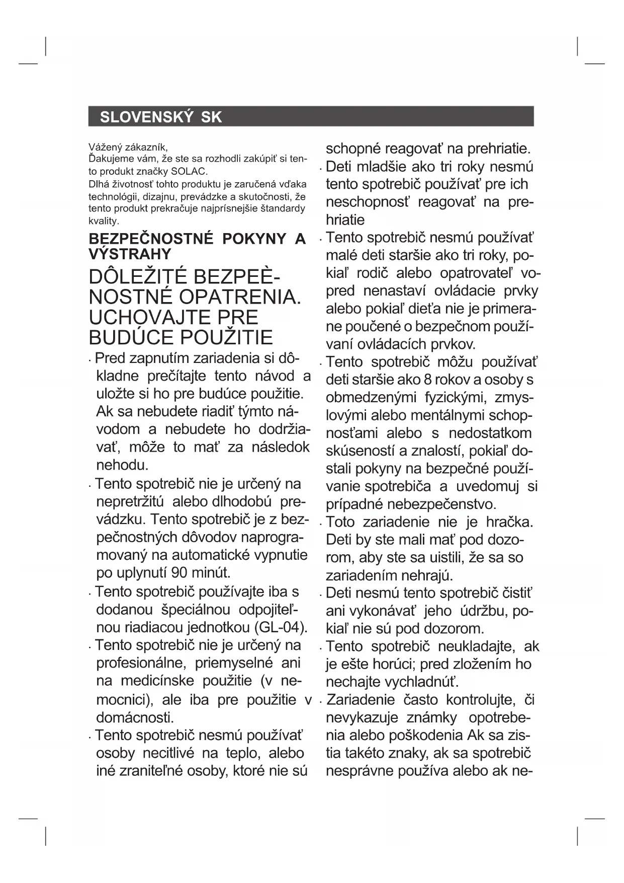 - Tento spotrebič nie je určený na nepretržitú alebo dlhodobú pre- vádzku. Tento spotrebič je z bez- pečnostných dôvodov naprogra- movaný na automatické vypnutie po uplynutí 90 minút.