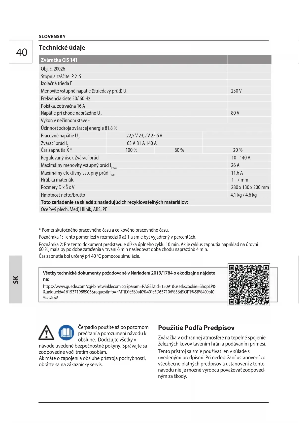 - Pomer skutočného pracovného času a celkového pracovného času. Poznámka 1: Tento pomer leží v rozmedzí 0 až 1 a smie byť vyjadrený v percentách. Poznámka 2: Pre tento dokument predstavuje dĺžka úplného cyklu 10 min. Ak je cyklus zapnutia napríklad na úrovni 60%, mala by po dobe zaťaženia v trvaní 6 min nasledovať doba chodu naprázdno 4 min. Čas zapnutia bol určený pri 40 °C pomocou simulácie. Všetky technické dokumenty požadované v Nariadení 2019/1784 o ekodizajne nájdete na: https://www.guede.com/cgi-bin/twinklecom.cgi?param=PAGE&tid=12091&useskscookie=ShopLP& &uniqueid=1615371988905&requestinfo=riMTID%5B%40%40%5D657106%3BriSOPT%5B%40%40 %5D8) Teplota okolia -10 °C - +40 °C Relatívna vlhkosť vzduchu max. 50 % (40 °C), 90% (20 °C) Nadmorská výška max. 1000 m Okolitý vzduch nesmie obsahovať neobvyklé množstvo prachu, kyselín, korozívnych plynov alebo látok. Upozorňujeme, že naše zariadenia neboli svojím určením konštruované na živnostenské, remeselné alebo priemyselné použitie. Ak sa zariadenie použije v živnostenských, remeselných alebo priemyselných prevádzkach alebo pri obdobných činnostiach, nemôžeme prevziať žiadnu záruku. Bezpečnotné pokyny POZOR! Úraz elektrickým prúdom! Existuje riziko úrazu elektrickým prúdom! Prevádzka je povolená len s ochranným vypínačom proti chybovému prúdu (RCD max. chybový prúd30 mA). Zváračka má stupeň ochrany IP21 a nesmie sa vystavovať dažďu a vlhkosti počas prevádzky a skladovania. Skontrolujte napätie. Technické údaje uvedené na typovom štítku musia súhlasiť s napätím elektrickej siete. Zasuňte vidlicu elektrického káblu do zásuvky, vhod