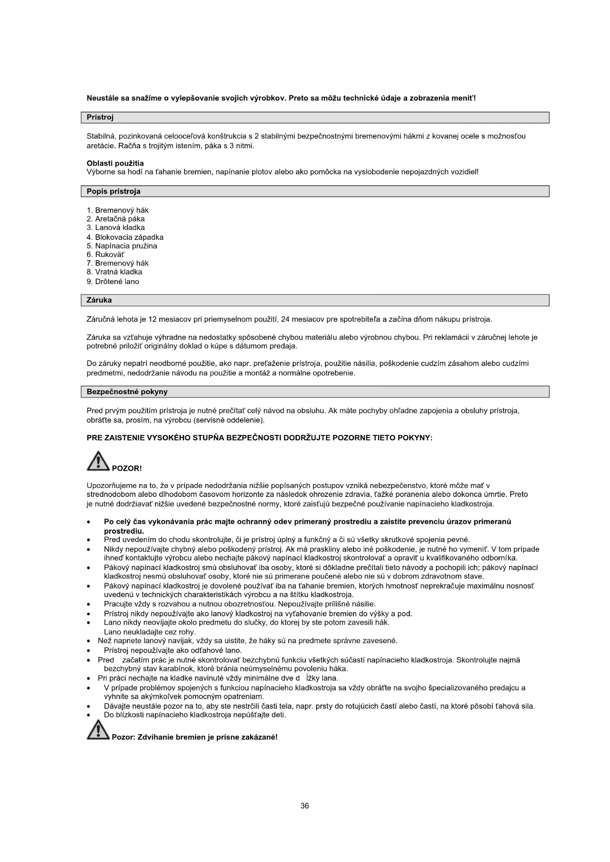 Záruka Záruþná lehota je 12 mesiacov pri priemyselnom použití, 24 mesiacov pre spotrebiteĐa a zaþína dĖom nákupu prístroja. Záruka sa vzĢahuje výhradne na nedostatky spôsobené chybou materiálu alebo výrobnou chybou. Pri reklamácii v záruþnej lehote je potrebné priložiĢ originálny doklad o kúpe s dátumom predaja. Do záruky nepatrí neodborné použitie, ako napr. preĢaženie prístroja, použitie násilia, poškodenie cudzím zásahom alebo cudzími predmetmi, nedodržanie návodu na použitie a montáž a normálne opotrebenie. Bezpeþnostné pokyny Pred prvým použitím prístroja je nutné preþítaĢ celý návod na obsluhu. Ak máte pochyby ohĐadne zapojenia a obsluhy prístroja, obráĢte sa, prosím, na výrobcu (servisné oddelenie). PRE ZAISTENIE VYSOKÉHO STUPĕA BEZPEýNOSTI DODRŽUJTE POZORNE TIETO POKYNY: POZOR! UpozorĖujeme na to, že v prípade nedodržania nižšie popísaných postupov vzniká nebezpeþenstvo, ktoré môže maĢ v strednodobom alebo dlhodobom þasovom horizonte za následok ohrozenie zdravia, Ģažké poranenia alebo dokonca úmrtie. Preto je nutné dodržiavaĢ nižšie uvedené bezpeþnostné normy, ktoré zaisĢujú bezpeþné používanie napínacieho kladkostroja. x Po celý þas vykonávania prác majte ochranný odev primeraný prostrediu a zaistite prevenciu úrazov primeranú prostrediu. x Pred uvedením do chodu skontrolujte, þi je prístroj úplný a funkþný a þi sú všetky skrutkové spojenia pevné. x Nikdy nepoužívajte chybný alebo poškodený prístroj. Ak má praskliny alebo iné poškodenie, je nutné ho vymeniĢ. V tom prípade ihneć kontaktujte výrobcu alebo nechajte pákový napínací kladkostroj skontrolovaĢ a opraviĢ u kvalifikovaného odborníka. x Pákový napínací kladkostroj smú obsluhovaĢ iba osoby, ktoré si dôkladne preþítali tieto návody a pochopili ich; pákový napínací kladkostroj nesmú obsluhovaĢ osoby, ktoré nie sú primerane pouþené alebo nie sú v dobrom zdravotnom stave. x Pákový napínací kladkostroj je dovolené používaĢ iba na Ģahanie bremien, ktorých hmotnosĢ neprekraþuje maximálnu nosnosĢ uvedenú v technických charakteristikách výrobcu a na štítku kladkostroja. x Pracujte vždy s rozvahou a nutnou obozretnosĢou. Nepoužívajte prílišné násilie. x Prístroj nikdy nepoužívajte ako lanový kladkostroj na vyĢahovanie bremien do výšky a pod. x Lano nikdy neovíjajte okolo predmetu do sluþky, do ktorej by ste potom zavesili hák. Lano neukladajte cez rohy. x Než napnete lanový navijak, vždy sa uistite, že háky sú na predmete správne zavesené. x Prístroj nepoužívajte ako odĢahové lano. x Pred zaþatím prác je nutné skontrolovaĢ bezchybnú funkciu všetkých súþastí napínacieho kladkostroja. Skontrolujte najmä bezchybný stav karabínok, ktoré bránia neúmyselnému povoleniu háka. x Pri práci nechajte na kladke navinuté vždy minimálne dve d Ďžky lana. x V prípade problémov spojených s funkciou napínacieho kladkostroja sa vždy obráĢte na svojho špecializovaného predajcu a vyhnite sa akýmkoĐvek pomocným opatreniam. x Dávajte neustále pozor na to, aby ste nestrþili þasti tela, napr. prsty do rotujúcich þastí alebo þastí, na ktoré pôsobí Ģahová sila. x Do blízkosti napínacieho kladkostroja nepúšĢajte deti. Pozor: Zdvíhanie bremien je prísne zakázané! 36Správanie v prípade núdze Zavećte úrazu zodpovedajúcu potrebnú prvú pomoc a vyzvite þo možno najrýchlejšie kvalifikovanú lekársku pomoc. ChráĖte zraneného pred ćalšími úrazmi a upokojte ho. Pre prípadnú nehodu musí byĢ na pracovisku vždy poruke lekárniþka prvej pomoci podĐa DIN 13164. Materiál, ktorý si z lekárniþky vezmete, je potrebné ihneć doplniĢ. Ak požadujete pomoc, uvećte tieto údaje: