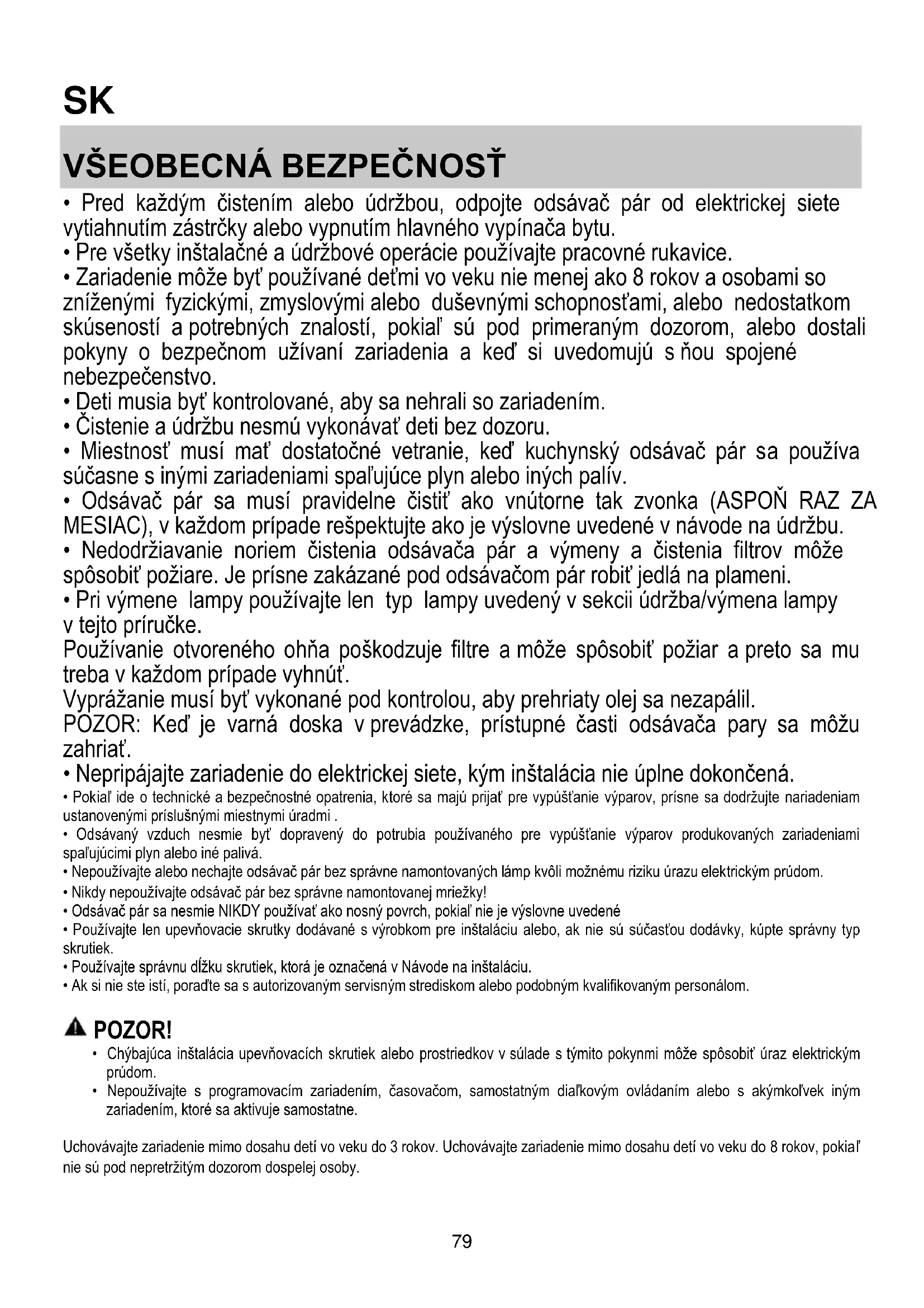 - Pri výmene lampy používajte len typ lampy uvedený v sekcii údržba/výmena lampy v tejto príručke. Používanie otvoreného ohňa poškodzuje filtre a môže spôsobiť požiar a preto sa mu treba v každom prípade vyhnúť. Vyprážanie musí byť vykonané pod kontrolou, aby prehriaty olej sa nezapálil. POZOR: Keď je varná doska v prevádzke, prístupné časti odsávača pary sa môžu zahriať.