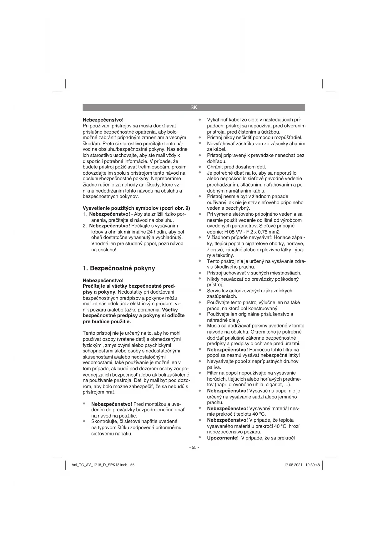 Vysávač na popol je určený na vysávanie stude- ného popola alebo studených zvyškov z komínov, pecí na drevené uhlie, popolníkov alebo grilov. Prístroj smie byť použitý len na ten účel, na ktorý bol určený. Akékoľvek iné odlišné použitie sa považuje za nespĺňajúce účel použitia. Za škody alebo zranenia akéhokoľvek druhu spôsobené nesprávnym používaním ručí používateľ / obslu- hujúca osoba, nie však výrobca. Prosím berte ohľad na skutočnosť, že naše príst- roje neboli svojim určením konštruované na profe- Anl_TC_AV_1718_D_SPK13.indb 56Anl_TC_AV_1718_D_SPK13.indb 56 17.08.2021 10:30:4817.08.2021 10:30:48SK