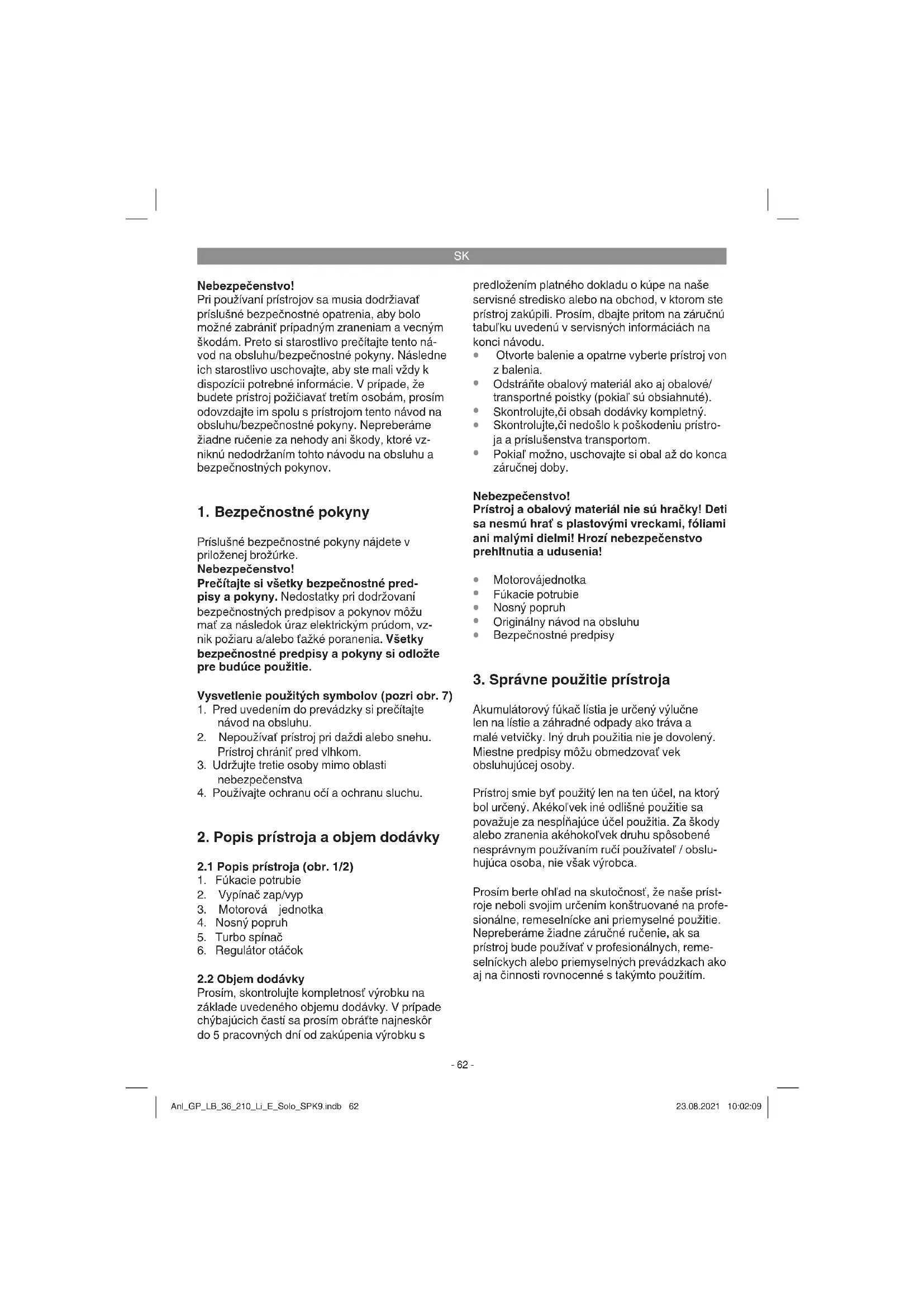 Akumulátorový fúkač lístia je určený výlučne len na lístie a záhradné odpady ako tráva a malé vetvičky. Iný druh použitia nie je dovolený. Miestne predpisy môžu obmedzovať vek obsluhujúcej osoby. Prístroj smie byť použitý len na ten účel, na ktorý bol určený. Akékoľvek iné odlišné použitie sa považuje za nespĺňajúce účel použitia. Za škody alebo zranenia akéhokoľvek druhu spôsobené nesprávnym používaním ručí používateľ / obslu- hujúca osoba, nie však výrobca. Prosím berte ohľad na skutočnosť, že naše príst- roje neboli svojim určením konštruované na profe- sionálne, remeselnícke ani priemyselné použitie. Nepreberáme žiadne záručné ručenie, ak sa prístroj bude používať v profesionálnych, reme- selníckych alebo priemyselných prevádzkach ako aj na činnosti rovnocenné s takýmto použitím. Anl_GP_LB_36_210_Li_E_Solo_SPK9.indb 62Anl_GP_LB_36_210_Li_E_Solo_SPK9.indb 62 23.08.2021 10:02:0923.08.2021 10:02:09SK