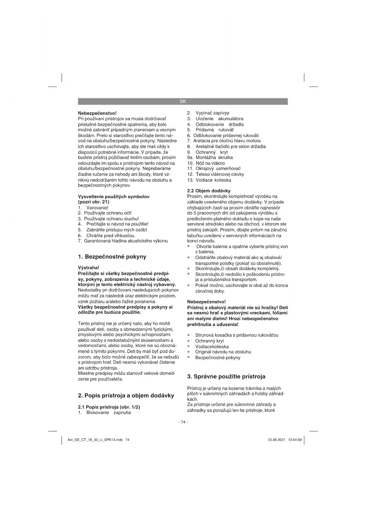 Prístroj je určený na kosenie trávnika a malých plôch v súkromných záhradách a hobby záhrad- kách. Za prístroje určené pre súkromné záhrady a záhradky sa považujú len tie prístroje, ktoré Anl_GE_CT_18_30_Li_SPK13.indb 74Anl_GE_CT_18_30_Li_SPK13.indb 74 23.08.2021 13:04:5923.08.2021 13:04:59SK