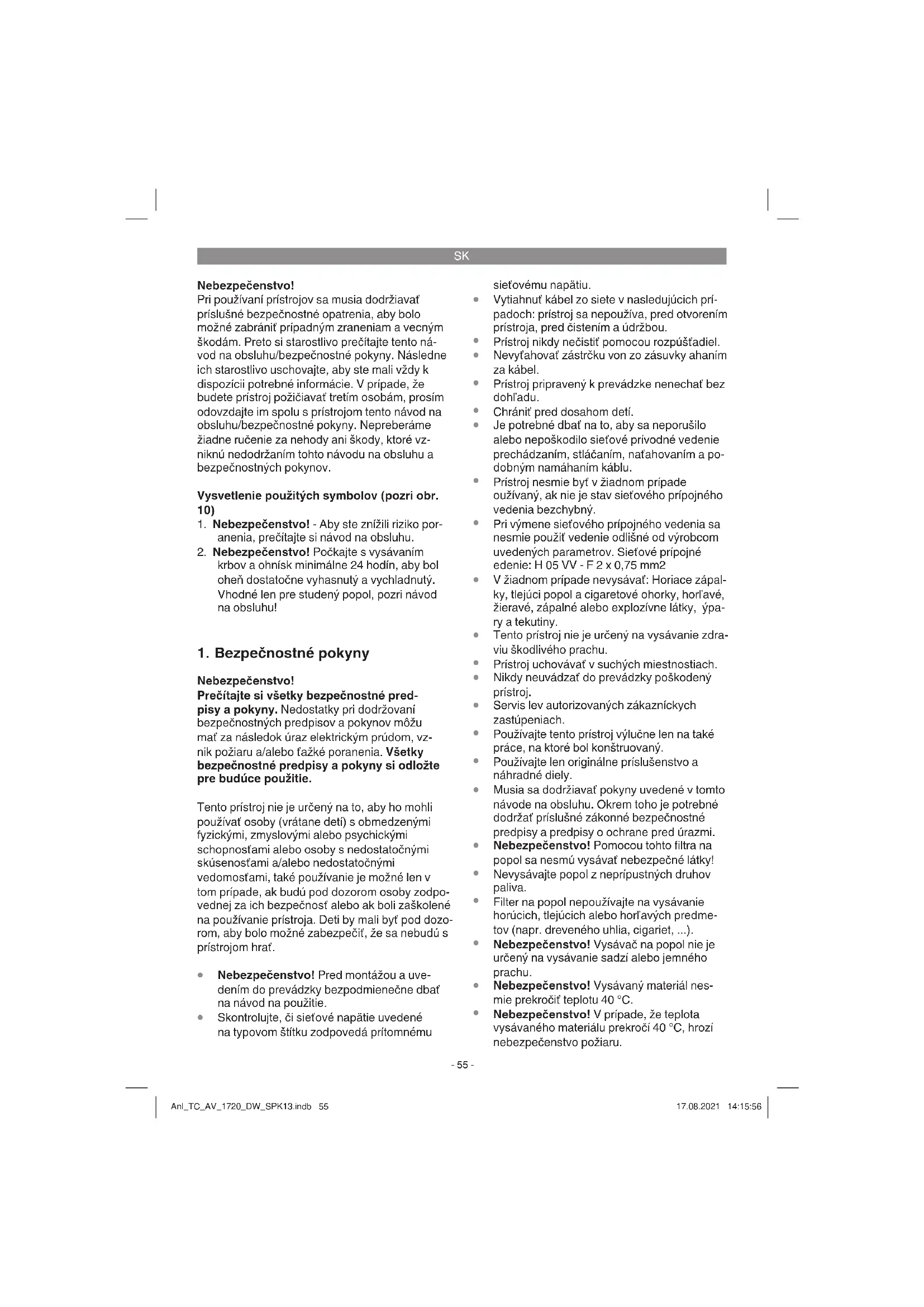 Nebezpečenstvo! V prípade, že teplota vysávaného materiálu prekročí 40 °C, hrozí nebezpečenstvo požiaru. Anl_TC_AV_1720_DW_SPK13.indb 55Anl_TC_AV_1720_DW_SPK13.indb 55 17.08.2021 14:15:5617.08.2021 14:15:56SK