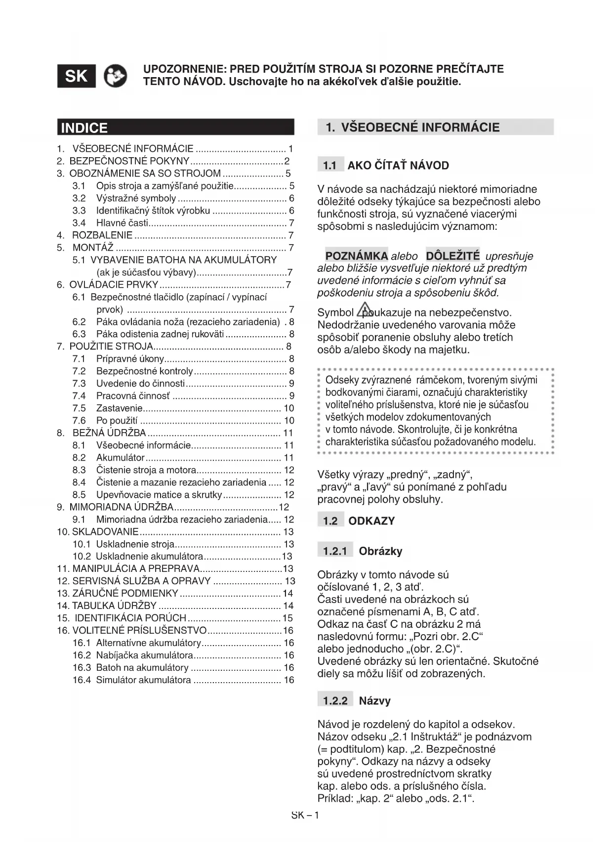 Návod je rozdelený do kapitol a odsekov. Názov odseku „2.1 Inštruktáž“ je podnázvom (= podtitulom) kap. „2. Bezpečnostné pokyny“. Odkazy na názvy a odseky sú uvedené prostredníctvom skratky kap. alebo ods. a príslušného čísla. Príklad: „kap. 2“ alebo „ods. 2.1“. INDICE