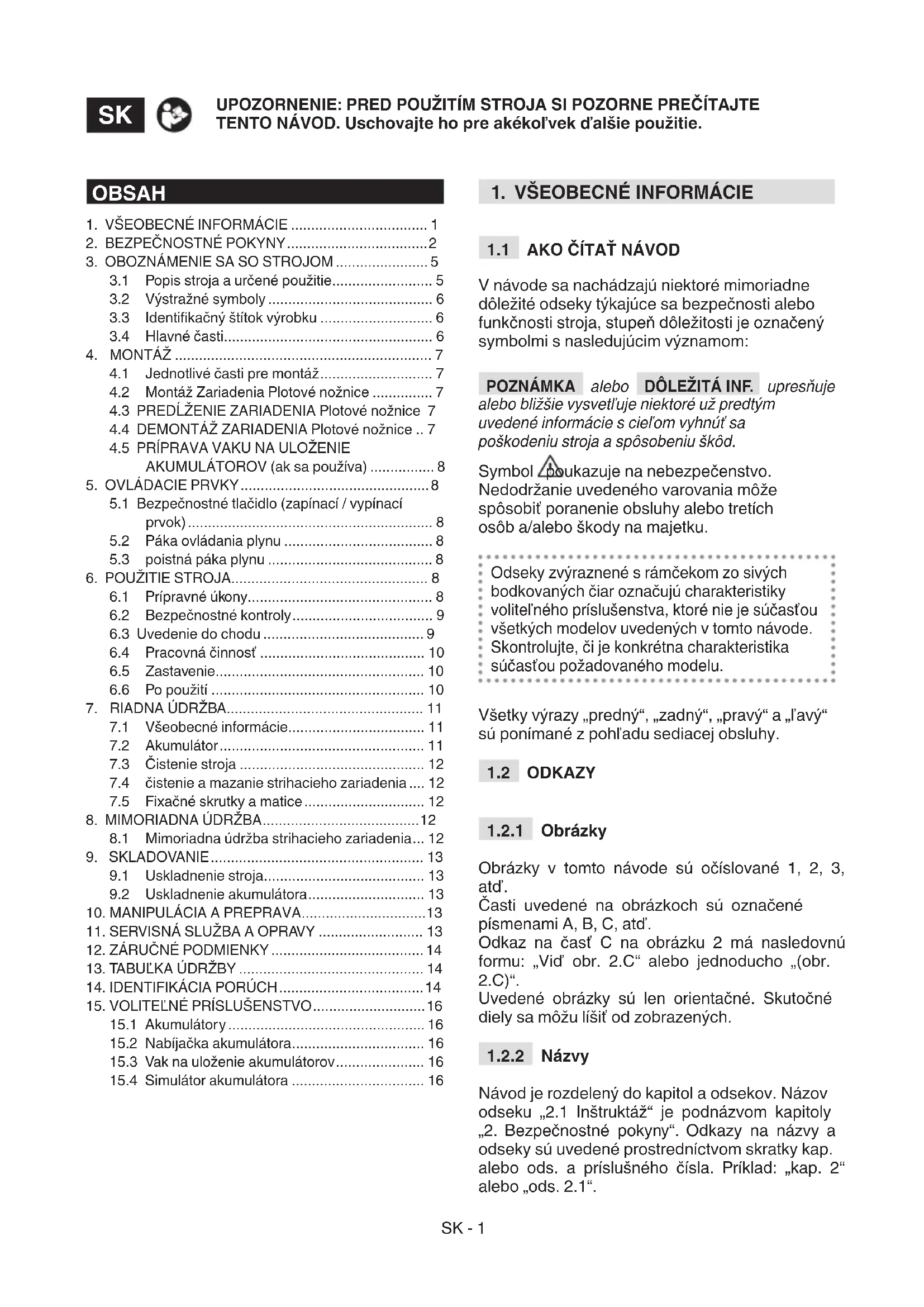 Návod je rozdelený do kapitol a odsekov. Názov odseku „2.1 Inštruktáž“ je podnázvom kapitoly „2. Bezpečnostné pokyny“. Odkazy na názvy a odseky sú uvedené prostredníctvom skratky kap. alebo ods. a príslušného čísla. Príklad: „kap. 2“ alebo „ods. 2.1“. OBSAH