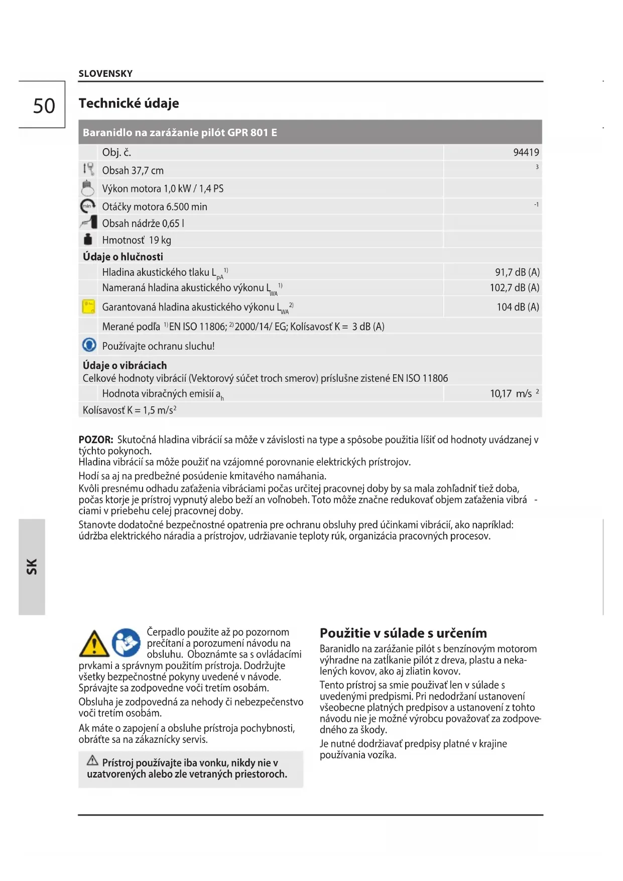 ciami v priebehu celej pracovnej doby. Stanovte dodatočné bezpečnostné opatrenia pre ochranu obsluhy pred účinkami vibrácií, ako napríklad: údržba elektrického náradia a prístrojov, udržiavanie teploty rúk, organizácia pracovných procesov. SLOVENSKY Čerpadlo použite až po pozornom prečítaní a porozumení návodu na obsluhu. Oboznámte sa s ovládacími prvkami a správnym použitím prístroja. Dodržujte všetky bezpečnostné pokyny uvedené v návode. Správajte sa zodpovedne voči tretím osobám. Obsluha je zodpovedná za nehody či nebezpečenstvo voči tretím osobám. Ak máte o zapojení a obsluhe prístroja pochybnosti, obráťte sa na zákaznícky servis. Prístroj používajte iba vonku, nikdy nie v uzatvorených alebo zle vetraných priestoroch. Použitie v súlade s určením Baranidlo na zarážanie pilót s benzínovým motorom výhradne na zatĺkanie pilót z dreva, plastu a neka- lených kovov, ako aj zliatin kovov. Tento prístroj sa smie použivať len v súlade s uvedenými predpismi. Pri nedodržaní ustanovení všeobecne platných predpisov a ustanovení z tohto návodu nie je možné výrobcu považovať za zodpove