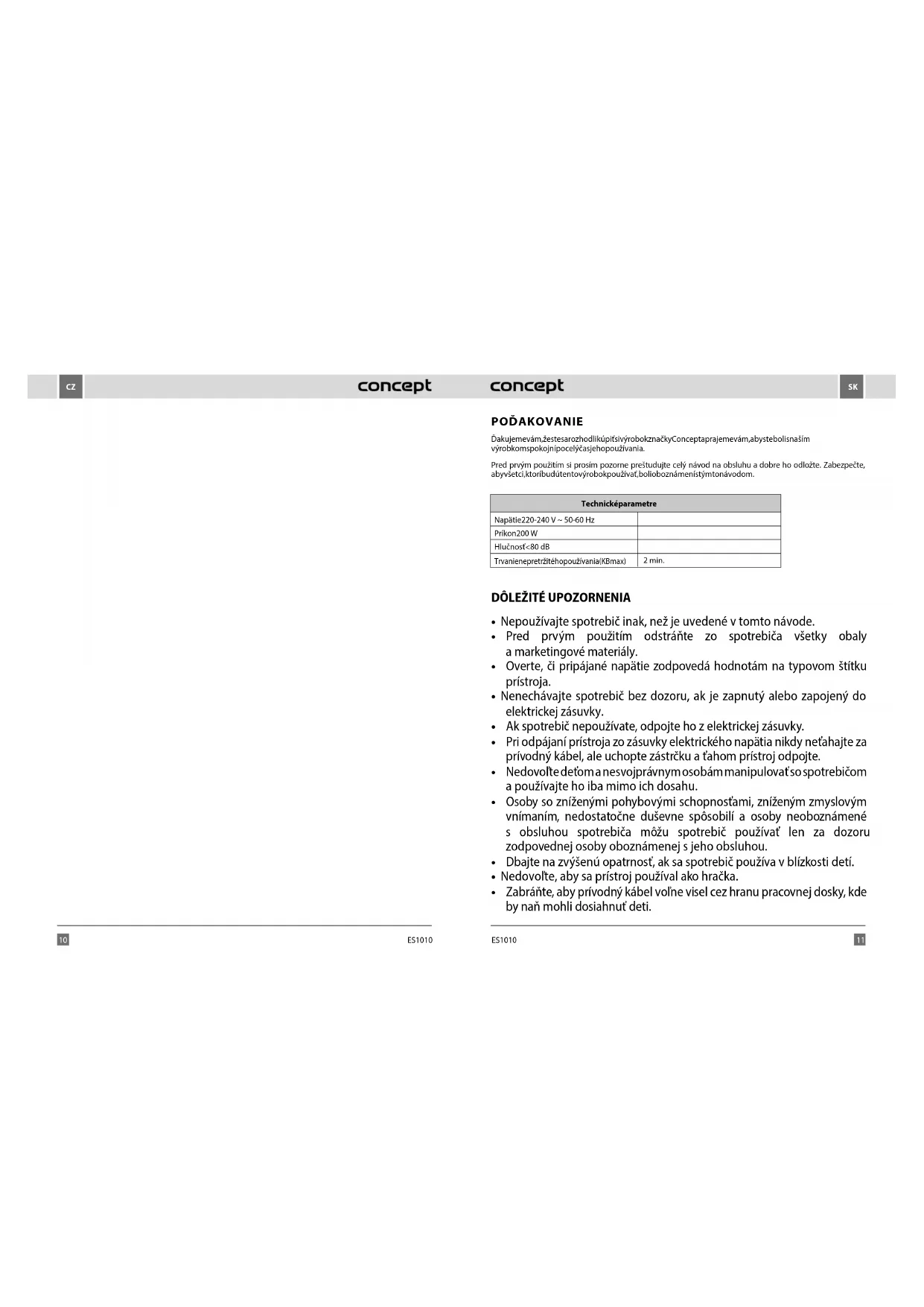 Ďakujeme vám, že ste sa rozhodli kúpiť si výrobok značky Concept a prajeme vám, aby ste boli s naším výrobkom spokojní po celý čas jeho používania. Pred prvým použitím si prosím pozorne preštudujte celý návod na obsluhu a dobre ho odložte. Zabezpečte, aby všetci, ktorí budú tento výrobok používať, boli oboznámení s týmto návodom. Technické parametre Napätie 220-240 V ~ 50-60 Hz Príkon 200 W Hlučnosť <80 dB Trvanie nepretržitého používania (KB max) 2 min.