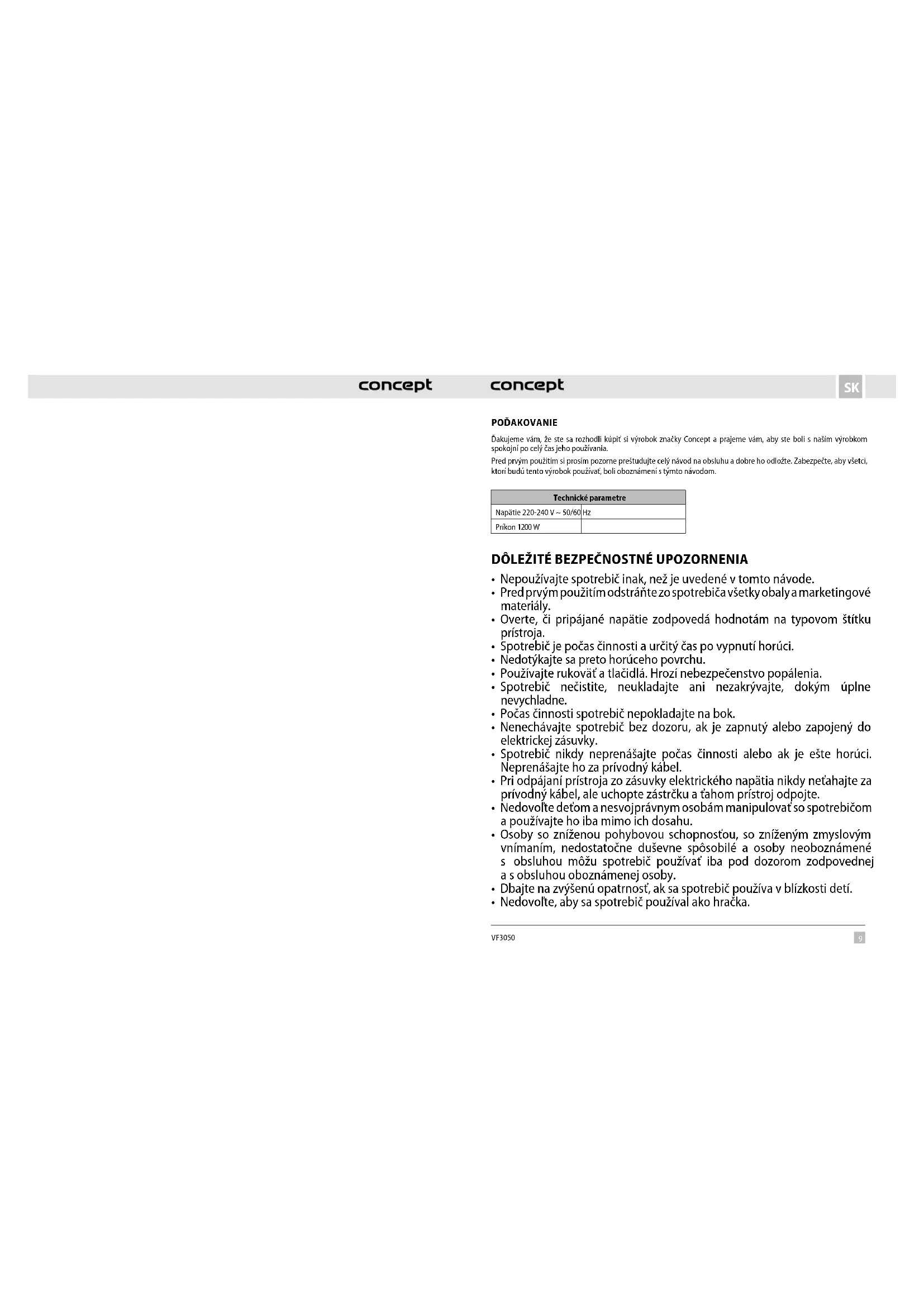 VF3050 POĎAKOVANIE Ďakujeme vám, že ste sa rozhodli kúpiť si výrobok značky Concept a prajeme vám, aby ste boli s naším výrobkom spokojní po celý čas jeho používania. Pred prvým použitím si prosím pozorne preštudujte celý návod naobsluhu a dobre ho odložte. Zabezpečte, aby všetci, ktorí budú tento výrobok používať, boli oboznámení stýmto návodom. Technické parametre Napätie 220-240 V ~ 50/60 Hz Príkon 1200 W
