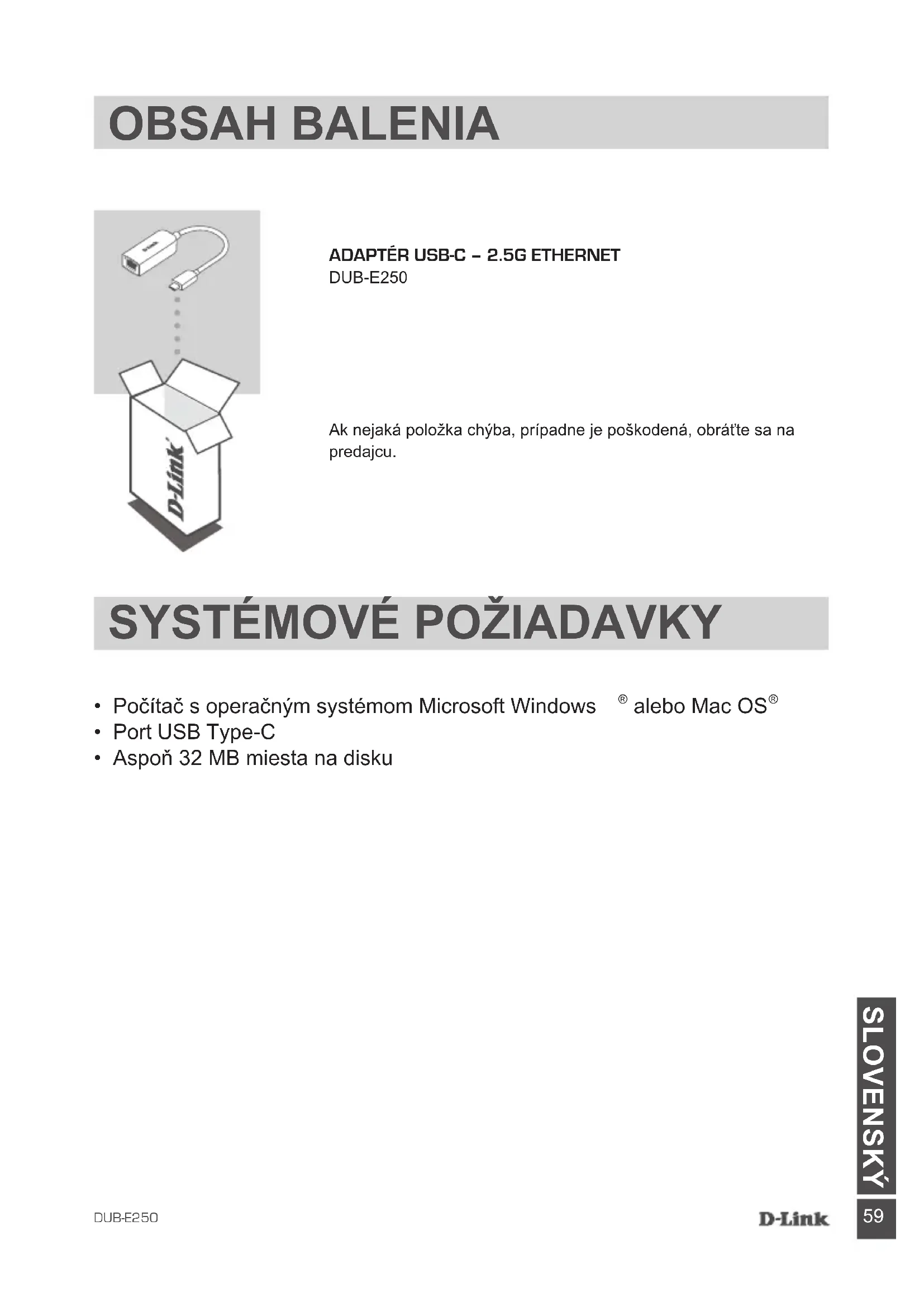 SLOVENSKÝ AdAptÉr USB-C – 2.5G EthErnEt DUB-E250 Ak nejaká položka chýba, prípadne je poškodená, obráťte sa na predajcu. OBSAH BALENIA