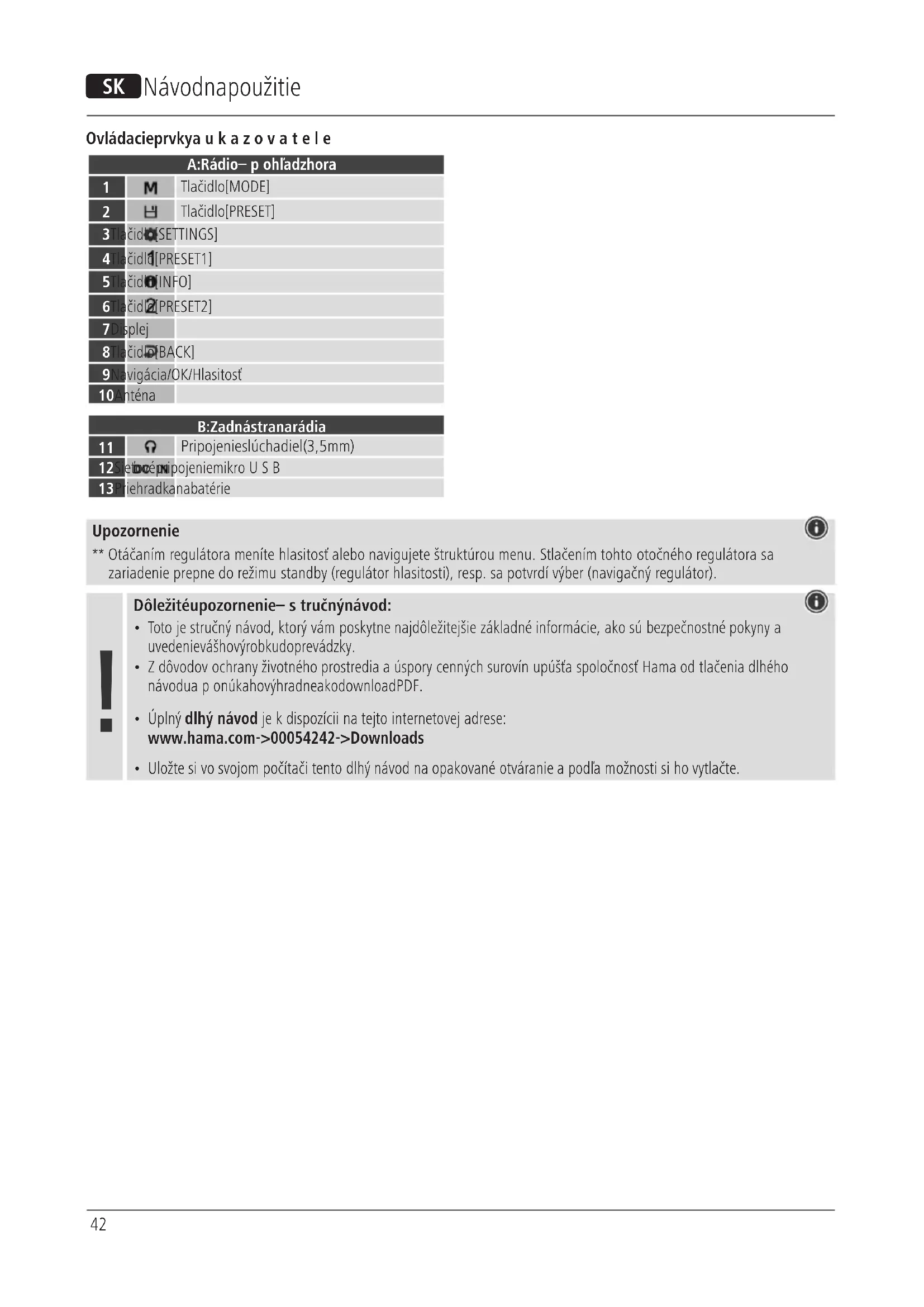 - Úplný dlhý návod je kdispozícii na tejto internetovej adrese: www.hama.com -> 00054242 -> Downloads